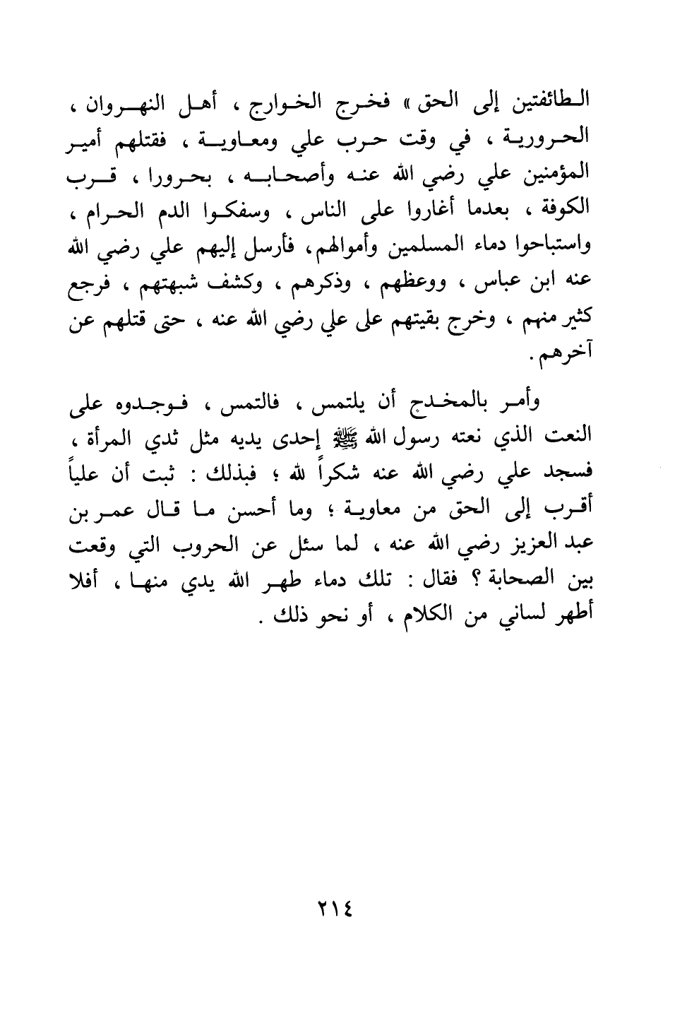 وأمر بالمخدج أن يلتمس، فالتمس، فوجدوه على النعت الذي نعته رسول الله صلى الله عليه وسلم إحدى يديه مثل ثدي المرأة، فسجد علي رضي الله عنه شكرا لله. فبذلك ثبت أن عليا أقرب إلى الحق من معاوية. وما أحسن ما قال عمر بن عبد العزيز رضي الله عنه لما سئل عن الحروب التي وقعت بين الصحابة، فقال: تلك دماء طهر الله يدي منها، أفلا أطهر لساني من الكلام، أو نحو ذلك.