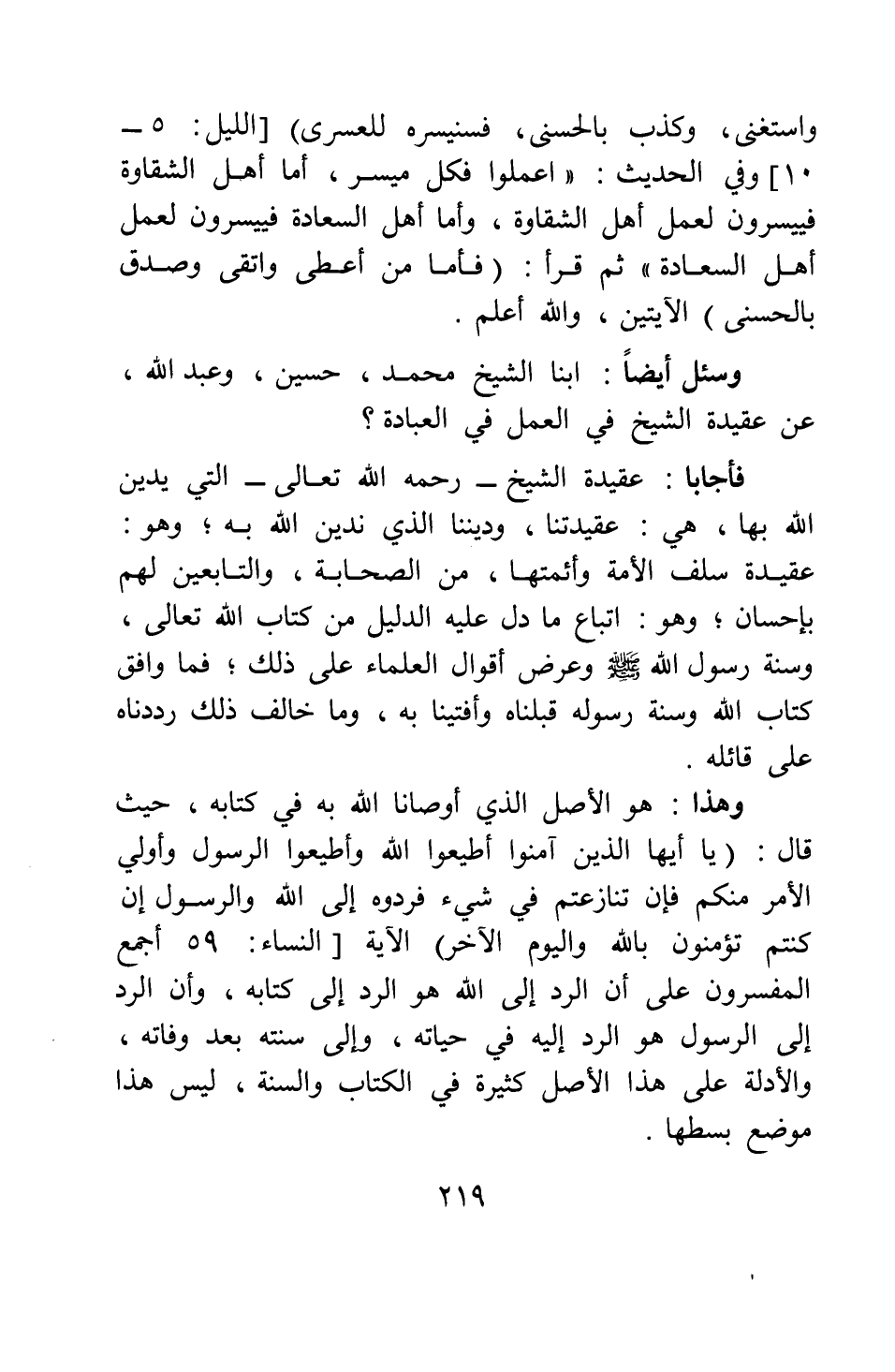 وسئل أيضا ابنا الشيخ محمد، حسين وعبد الله، عن عقيدة الشيخ في العمل في العبادة.