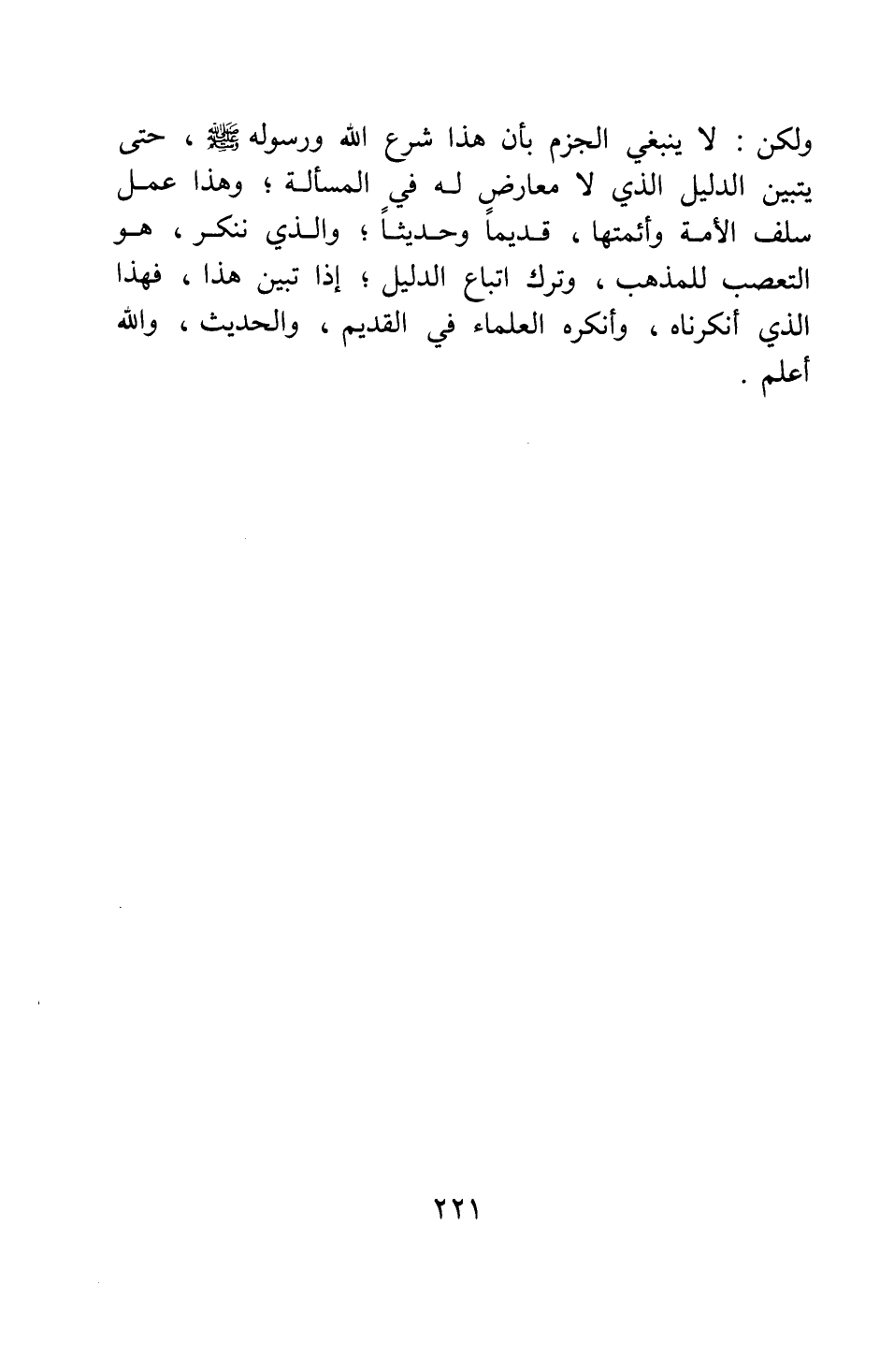 ولكن لا ينبغي الجزم بأن هذا شرع الله ورسوله صلى الله عليه وسلم حتى يتبين الدليل الذي لا معارض له في المسألة ; وهذا عمل سلف الأمة وأئمتها، قديما وحديثا. والذي ننكر هو التعصب للمذهب، وترك اتباع الدليل، إذا تبين هذا، فهذا الذي أنكرناه، وأنكره العلماء في القديم والحديث، والله أعلم.