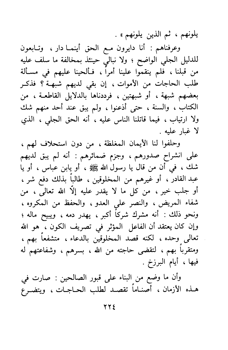 وحلفوا لنا الأيمان المغلظة، من دون استحلاف لهم، على انشراح صدورهم، وجزم ضمائرهم أنه لم يبق لديهم شك، في أن من قال: يا رسول الله صلى الله عليه وسلم، أو يا ابن عباس، أو يا عبد القادر، أو غيرهم من المخلوقين، طالبا بذلك دفع شر، أو جلب خير، من كل ما لا يقدر عليه إلا الله تعالى، من شفاء المريض، والنصر على العدو، والحفظ من المكروه، ونحو ذلك، أنه مشرك شركا أكبر، يهدر دمه، ويبيح ماله، وإن كان يعتقد أن الفاعل المؤثر في تصريف الكون، هو الله تعالى وحده، لكنه قصد المخلوقين بالدعاء، متشفعا بهم، ومتقربا بهم، لتقضى حاجته من الله بسرهم، وشفاعتهم له فيها، أيام البرزخ.