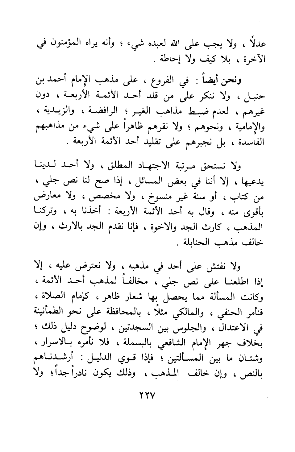 ونحن أيضا في الفروع، على مذهب الإمام أحمد بن حنبل، ولا ننكر على من قلد أحد الأئمة الأربعة، دون غيرهم، لعدم ضبط مذاهب الغير، الرافضة، والزيدية، والإمامية، ونحوهم، ولا نقرهم ظاهرا على شيء من مذاهبهم الفاسدة، بل نجبرهم على تقليد أحد الأئمة الأربعة.