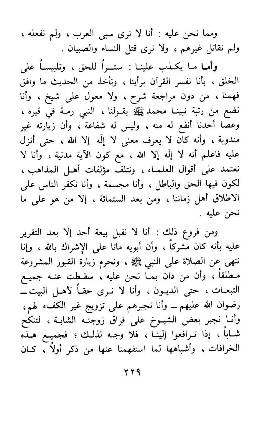 ومن فروع ذلك: أنا لا نقبل بيعة أحد إلا بعد التقرير عليه بأنه كان مشركا، وأن أبويه ماتا على الإشراك بالله، وإنا ننهى عن الصلاة على النبي صلى الله عليه وسلم، ونحرم زيارة القبور المشروعة مطلقا، وأن من دان بما نحن عليه، سقطت عنه جميع التبعات، حتى الديون، وأنا لا نرى حقا لأهل البيت - رضوان الله عليهم -، وأنا نجبرهم على تزويج غير الكفء لهم، وأنا نجبر بعض الشيوخ على فراق زوجته الشابة، لتنكح شابا، إذا ترافعوا إلينا، فلا وجه لذلك، فجميع هذه الخرافات. وأشباهها لما استفهمنا عنها من ذكر أولا، كان