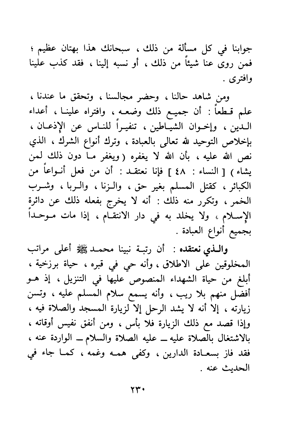 والذي نعتقده أن رتبة نبينا محمد صلى الله عليه وسلم أعلى مراتب المخلوقين على الإطلاق، وأنه حي في قبره، حياة برزخية، أبلغ من حياة الشهداء المنصوص عليها في التنْزيل، إذ هو أفضل منهم بلا ريب، وأنه يسمع سلام المسلم عليه، وتسن زيارته، إلا أنه لا يشد الرحل إلا لزيارة المسجد والصلاة فيه، إذا قصد مع ذلك الزيارة فلا بأس، ومن أنفق نفيس أوقاته بالاشتغال بالصلاة عليه - عليه الصلاة والسلام - الواردة عنه، فقد فاز بسعادة الدارين، وكفي همه وغمه، كما جاء في الحديث عنه.