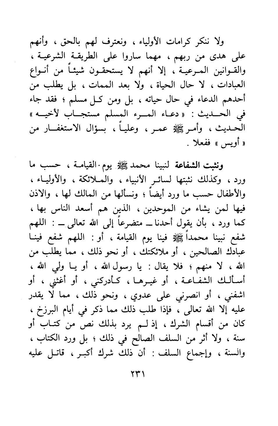 ونثبت الشفاعة لنبينا محمد صلى الله عليه وسلم يوم القيامة حسب ما ورد، وكذلك نثبتها لسائر الأنبياء، والملائكة، والأولياء، والأطفال حسب ما ورد أيضا، ونسألها من المالك لها، والإذن فيها لمن يشاء من الموحدين، الذين هم أسعد الناس بها، كما ورد، بأن يقول أحدنا - متضرعا إلى الله تعالى: اللهم شفع نبينا محمدا صلى الله عليه وسلم فينا يوم القيامة، أو: اللهم شفع فينا عبادك الصالحين، أو ملائكتك، أو نحو ذلك، مما يطلب من الله، لا منهم؛ فلا يقال: يا رسول الله، أو يا ولي الله، أسألك الشفاعة، أو غيرها، كأدركني، أو أغثني، أو اشفني، أو انصرني على عدوي، ونحو ذلك، مما لا يقدر عليه إلا الله تعالى. فإذا طلب ذلك مما ذكر في أيام البرزخ، كان من أقسام الشرك، إذ لم يرد بذلك نص من كتاب أو سنة، ولا أثر من السلف الصالح في ذلك، بل ورد الكتاب، والسنة وإجماع السلف أن ذلك شرك أكبر، قاتل عليه