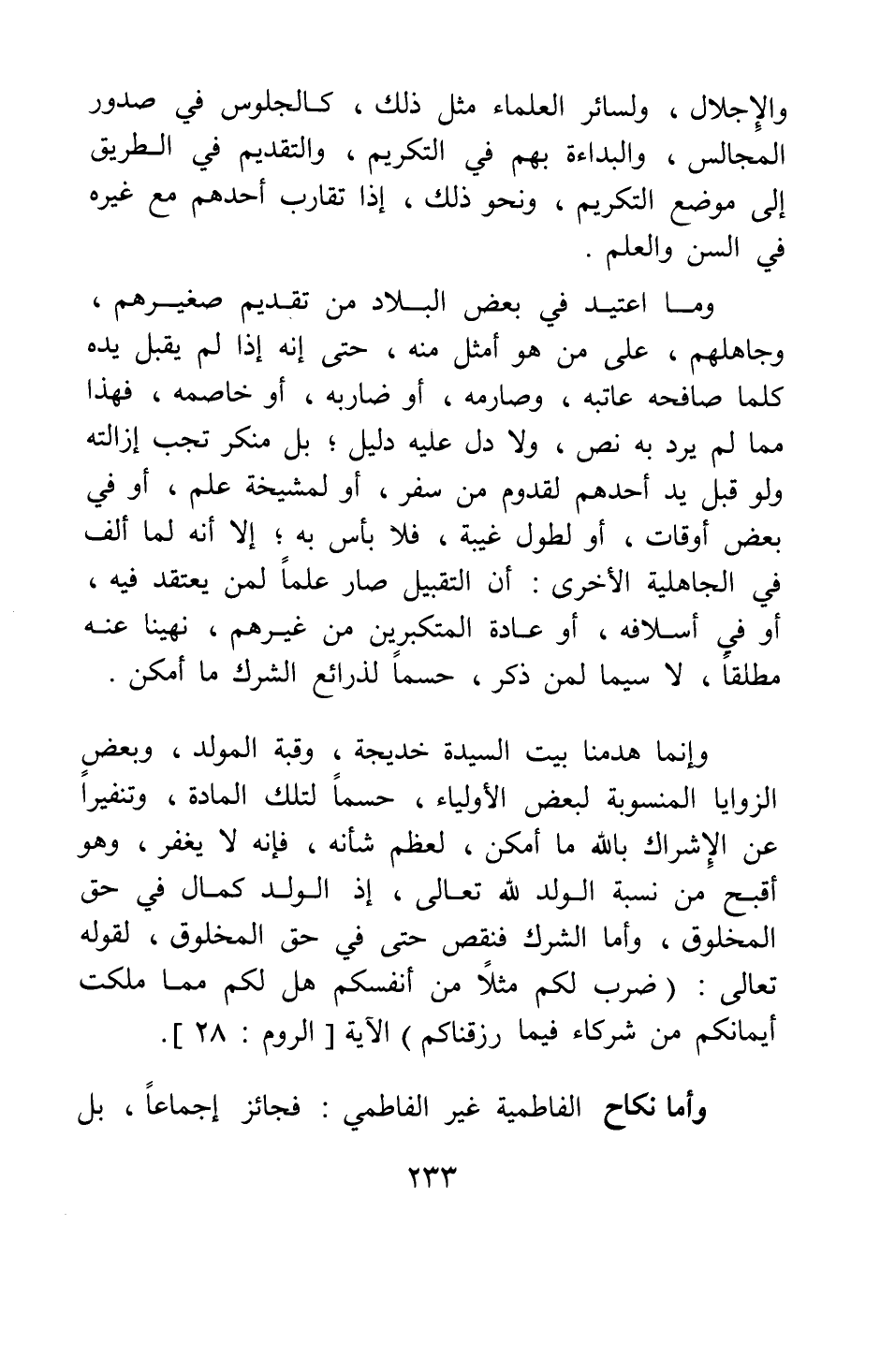 وإنما هدمنا بيت السيدة خديجة، وقبة المولد، وبعض الزوايا المنسوبة لبعض الأولياء، حسما لتلك المادة، وتنفيرا عن الإشراك بالله ما أمكن، لعظم شأنه؛ فإنه لا يغفر، وهو أقبح من نسبة الولد لله تعالى، إذ الولد كمال في حق المخلوق، وأما الشرك فنقص حتى في حق المخلوق، لقوله تعالى: {ضَرَبَ لَكُمْ مَثَلاً مِنْ أَنْفُسِكُمْ هَلْ لَكُمْ مِنْ مَا مَلَكَتْ أَيْمَانُكُمْ مِنْ شُرَكَاءَ فِي مَا رَزَقْنَاكُمْ} الآية [سورة الروم آية: 28] . وأما نكاح الفاطمية غير الفاطمي فجائز إجماعا، بل