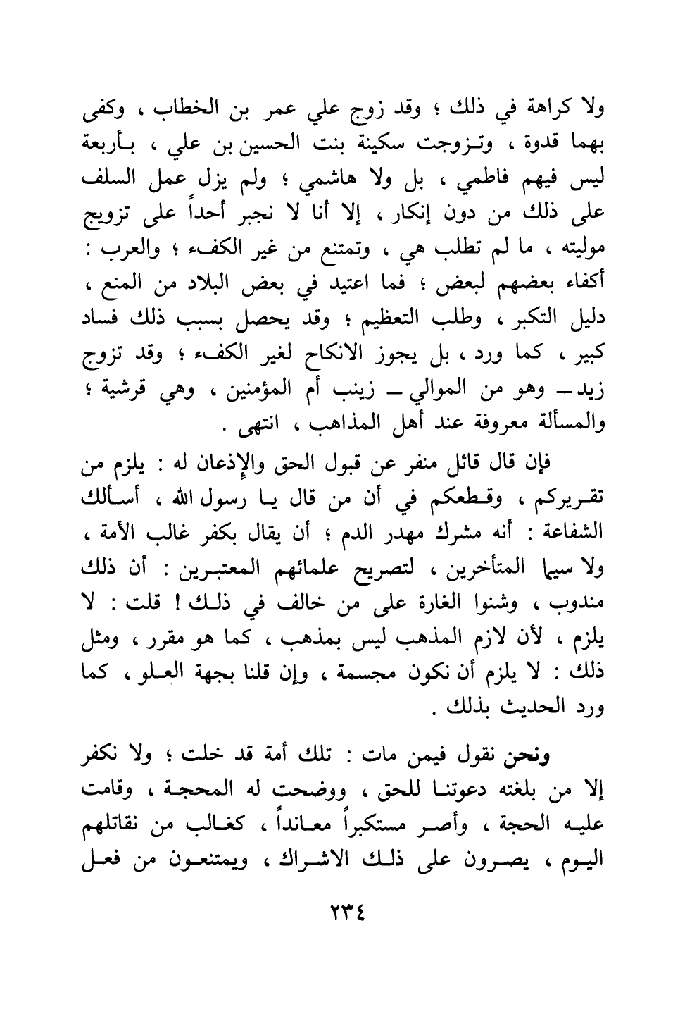 فإن قال قائل منفر عن قبول الحق والإذعان له: يلزم من تقريركم وقطعكم، في أن من قال: يا رسول الله، أسألك الشفاعة، أنه مشرك مهدر الدم، أن يقال بكفر غالب الأمة، ولا سيما المتأخرين، لتصريح علمائهم المعتبرين أن ذلك مندوب، وشنوا الغارة على من خالف في ذلك! قلت: لا يلزم، لأن لازم المذهب ليس بمذهب، كما هو مقرر، ومثل ذلك لا يلزم أن نكون مجسمة، وإن قلنا بجهة العلو، كما ورد الحديث بذلك.