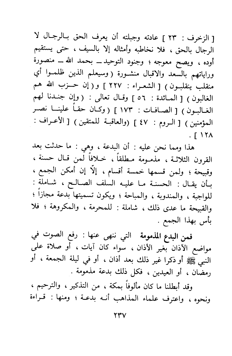 هذا ومما نحن عليه أن البدعة - وهي ما حدثت بعد القرون الثلاثة - مذمومة مطلقا، خلافا لمن قال حسنة، وقبيحة، ولمن قسمها خمسة أقسام، إلا إن أمكن الجمع ; بأن يقال: الحسنة ما عليه السلف الصالح شاملة للواجبة، والمندوبة، والمباحة ; ويكون تسميتها بدعة مجازا، والقبيحة ما عدا ذلك شاملة للمحرمة، والمكروهة، فلا بأس بهذا الجمع.