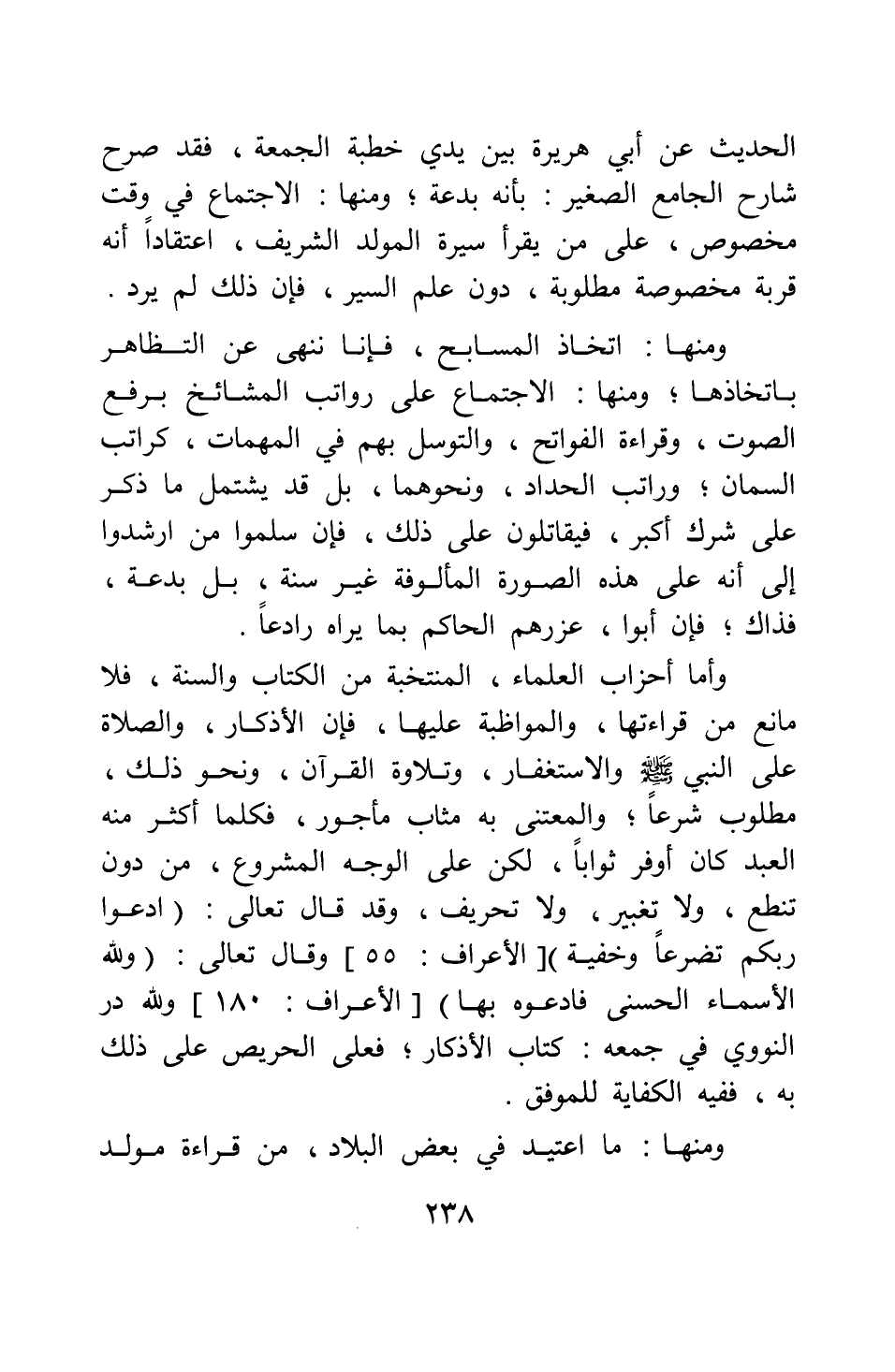 الحديث عن أبي هريرة بين يدي خطبة الجمعة، فقد صرح شارح الجامع الصغير بأنه بدعة. ومنها: الاجتماع في وقت مخصوص على من يقرأ سيرة المولد الشريف، اعتقادا أنه قربة مخصوصة مطلوبة، دون علم السير، فإن ذلك لم يرد.