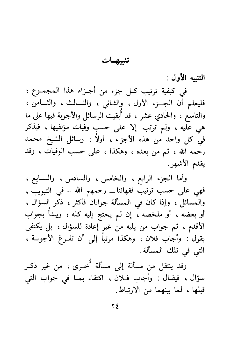 التنبيه الأول: في كيفية ترتيب كل جزء من أجزاء هذا المجموع; فليعلم أن الجزء الأول، والثاني، والثالث، والثامن، والتاسع، والحادي عشر، قد أبقيت الرسائل والأجوبة فيها على ما هي عليه، ولم ترتب إلا على حسب وفيات مؤلفيها، فيذكر في كل واحد من هذه الأجزاء، أولا: رسائل الشيخ محمد رحمه الله، ثم من بعده، وهكذا، على حسب الوفيات، وقد يقدم الأشهر.