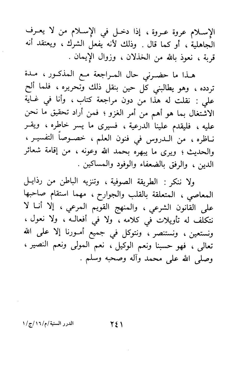 الإسلام عروة عروة إذا دخل في الإسلام من لا يعرف الجاهلية "، أو كما قال ; وذلك لأنه يفعل الشرك ويعتقد أنه قربة، نعوذ بالله من الخذلان، وزوال الإيمان. هذا ما حضرني حال المراجعة مع المذكور، مدة تردده، وهو يطالبني كل حين بنقل ذلك وتحريره، فلما ألح علي نقلت له هذا من دون مراجعة كتاب، وأنا في غاية الاشتغال بما هو أهم من أمر الغزو، فمن أراد تحقيق ما نحن عليه، فليقدم علينا الدرعية، فسيرى ما يسر خاطره، ويقر ناظره، من الدروس في فنون العلم، خصوصا التفسير، والحديث، ويرى ما يبهره بحمد الله وعونه، من إقامة شعائر الدين، والرفق بالضعفاء والوفود والمساكين.
