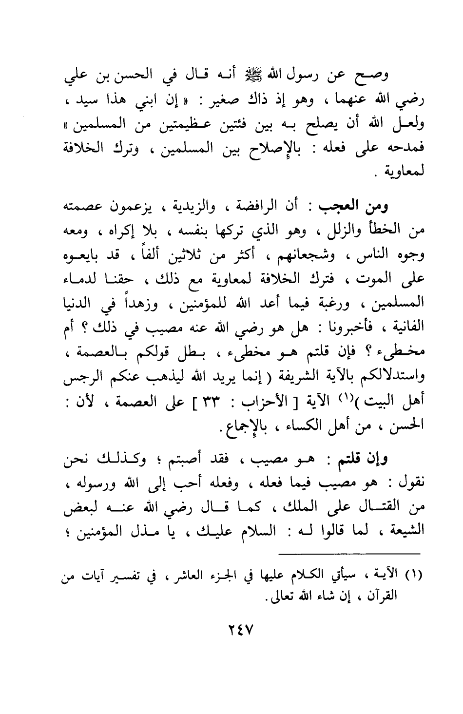وصح عن رسول الله صلى الله عليه وسلم أنه قال في الحسن بن علي رضي الله عنهما، وهو إذ ذاك صغير: " إن ابني هذا سيد، ولعل الله أن يصلح به بين فئتين عظيمتين من المسلمين " 1، فمدحه على فعله بالإصلاح بين المسلمين، وترك الخلافة لمعاوية. ومن العجب أن الرافضة، والزيدية، يزعمون عصمته من الخطأ والزلل، وهو الذي تركها بنفسه بلا إكراه ومعه وجوه الناس وشجعانهم أكثر من ثلاثين ألفا قد بايعوه على الموت، فترك الخلافة لمعاوية مع ذلك، حقنا لدماء المسلمين، ورغبة فيما أعد الله للمؤمنين، وزهدا في الدنيا الفانية، فأخبرونا: هل هو رضي الله عنه مصيب في ذلك، أم مخطئ؟ فإن قلتم: هو مخطئ، بطل قولكم بالعصمة، واستدلالكم بالآية الشريفة: {إِنَّمَا يُرِيدُ اللَّهُ لِيُذْهِبَ عَنْكُمُ الرِّجْسَ أَهْلَ الْبَيْتِ} 2 الآية على العصمة، لأن الحسن من أهل الكساء، بالإجماع.