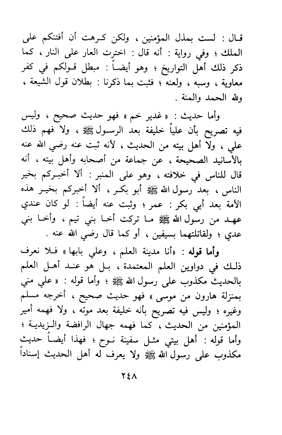 وأما قوله: " أنا مدينة العلم، وعلي بابها " 1 فلا نعرف ذلك في دواوين العلم المعتمدة، بل هو عند أهل العلم بالحديث مكذوب على رسول الله صلى الله عليه وسلم. وأما قوله: " علي مني بمنْزلة هارون من موسى " 2 فهو حديث صحيح، أخرجه مسلم وغيره، وليس فيه تصريح بأنه خليفة بعد موته، ولا فهمه أمير المؤمنين من الحديث، كما فهمه جهال الرافضة والزيدية ; وأما قوله: " أهل بيتي مثل سفينة نوح " فهذا أيضا حديث مكذوب على رسول الله صلى الله عليه وسلم ولا يعرف له أهل الحديث إسنادا