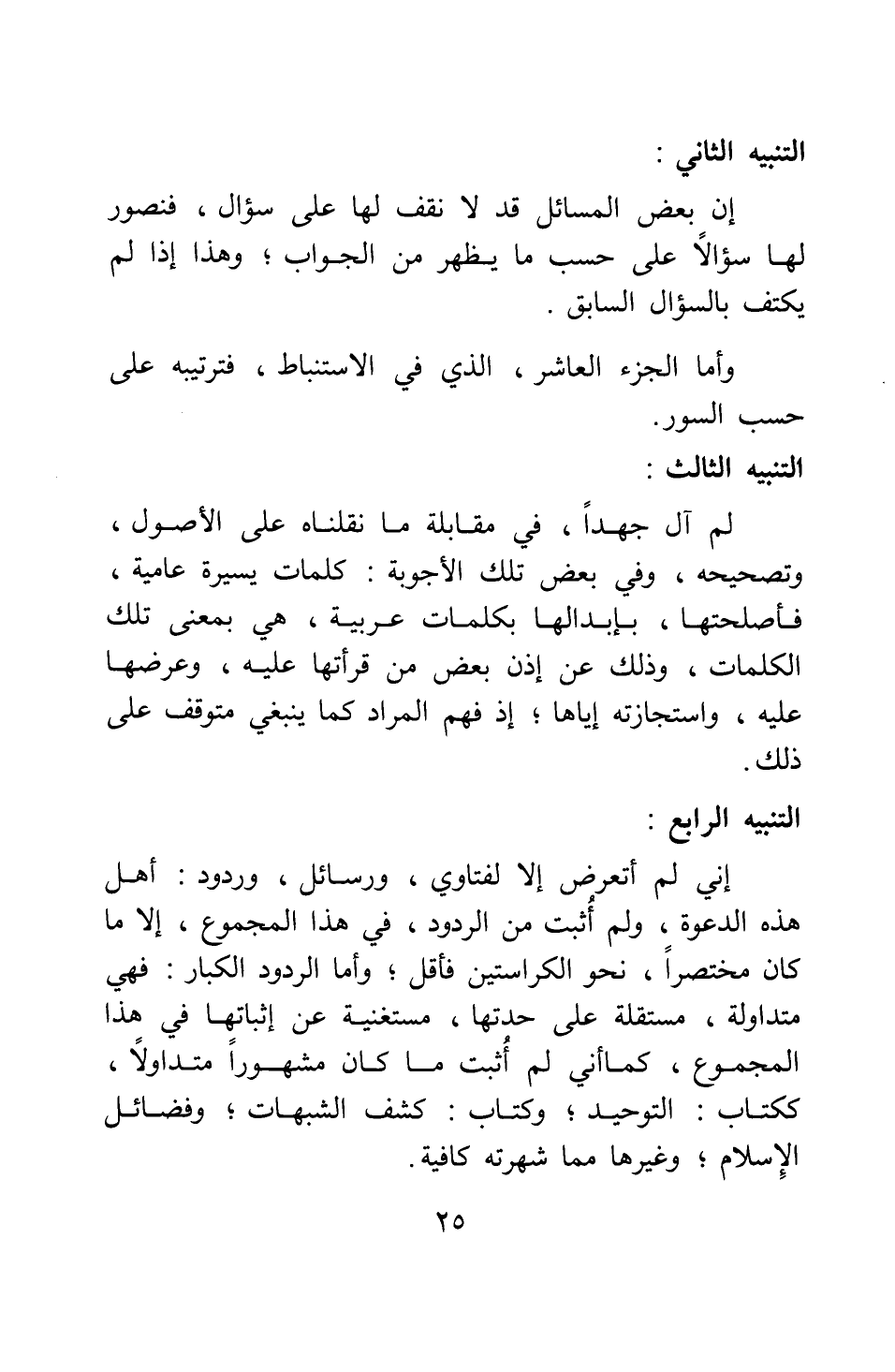 التنبيه الرابع: إني لم أتعرض إلا لفتاوى، ورسائل، وردود أهل هذه الدعوة، ولم أثبت من الردود، في هذا المجموع، إلا ما كان مختصرا، نحو الكراستين فأقل; وأما الردود الكبار: فهي متداولة، مستقلة على حدتها، مستغنية عن إثباتها في هذا المجموع، كما أني لم أثبت ما كان مشهورا متداولا، ككتاب التوحيد، وكتاب كشف الشبهات، وفضائل الإسلام، وغيرها مما شهرته كافية.