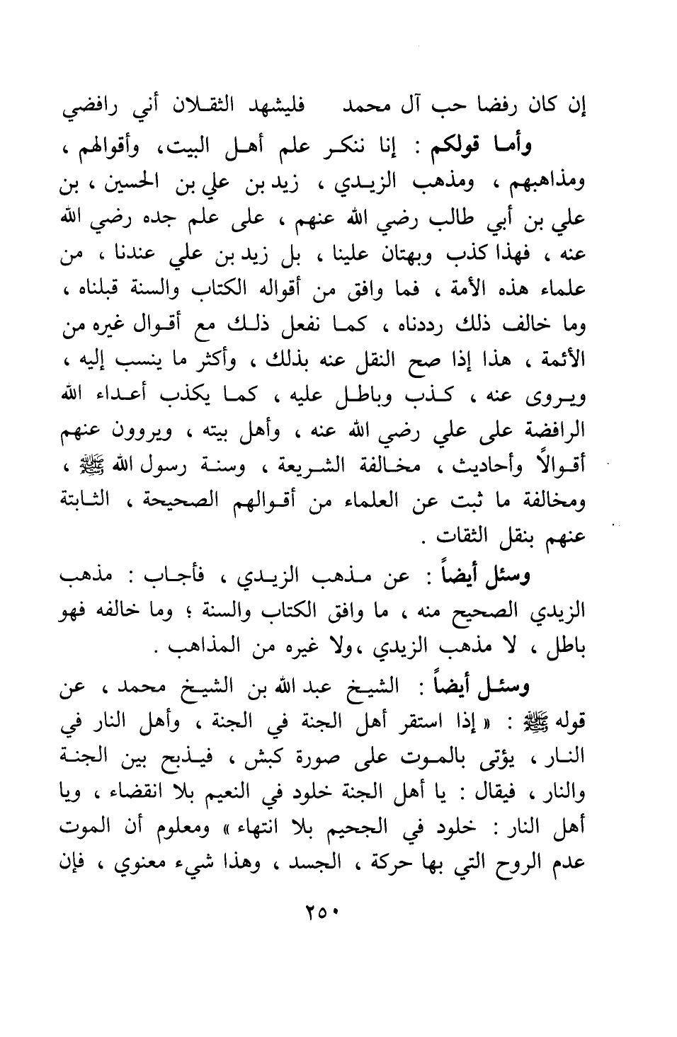 وأما قولكم: إنا ننكر علم أهل البيت، وأقوالهم، ومذاهبهم، ومذهب الزيدي، زيد بن علي بن الحسن، بن علي بن أبي طالب رضي الله عنهم، على علم جده رضي الله عنه فهذا كذب وبهتان علينا؛ بل زيد بن علي عندنا، من علماء هذه الأمة، فما وافق من أقواله الكتاب والسنة قبلناه، وما خالف ذلك رددناه، كما نفعل ذلك مع أقوال غيره من الأئمة، هذا إذا صح النقل عنه بذلك. وأكثر ما ينسب إليه، ويروى عنه، كذب وباطل عليه، كما يكذب أعداء الله الرافضة على علي رضي الله عنه وأهل بيته، ويروون عنهم أقوالا وأحاديث مخالفة للشريعة، وسنة رسول الله صلى الله عليه وسلم، ومخالفة ما ثبت عن العلماء من أقوالهم الصحيحة، الثابتة عنهم بنقل الثقات.