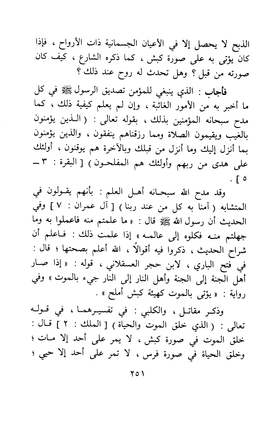وقد مدح الله سبحانه أهل العلم بأنهم يقولون في المتشابه: {آمَنَّا بِهِ كُلٌّ مِنْ عِنْدِ رَبِّنَا} [سورة آل عمران آية: 7] ، وفي الحديث أن رسول الله صلى الله عليه وسلم قال: " ما علمتم منه فاعملوا به، وما جهلتم منه فكلوه إلى عالمه " 1 إذا علمت ذلك فاعلم أن شراح الحديث ذكروا فيه أقوالا الله أعلم بصحتها; قال في فتح الباري لابن حجر العسقلاني: قوله صلى الله عليه وسلم:" إذا صار أهل الجنة إلى الجنة وأهل النار إلى النار جيء بالموت " 2، وفي رواية: " يؤتى بالموت كهيئة كبش أملح " 3.