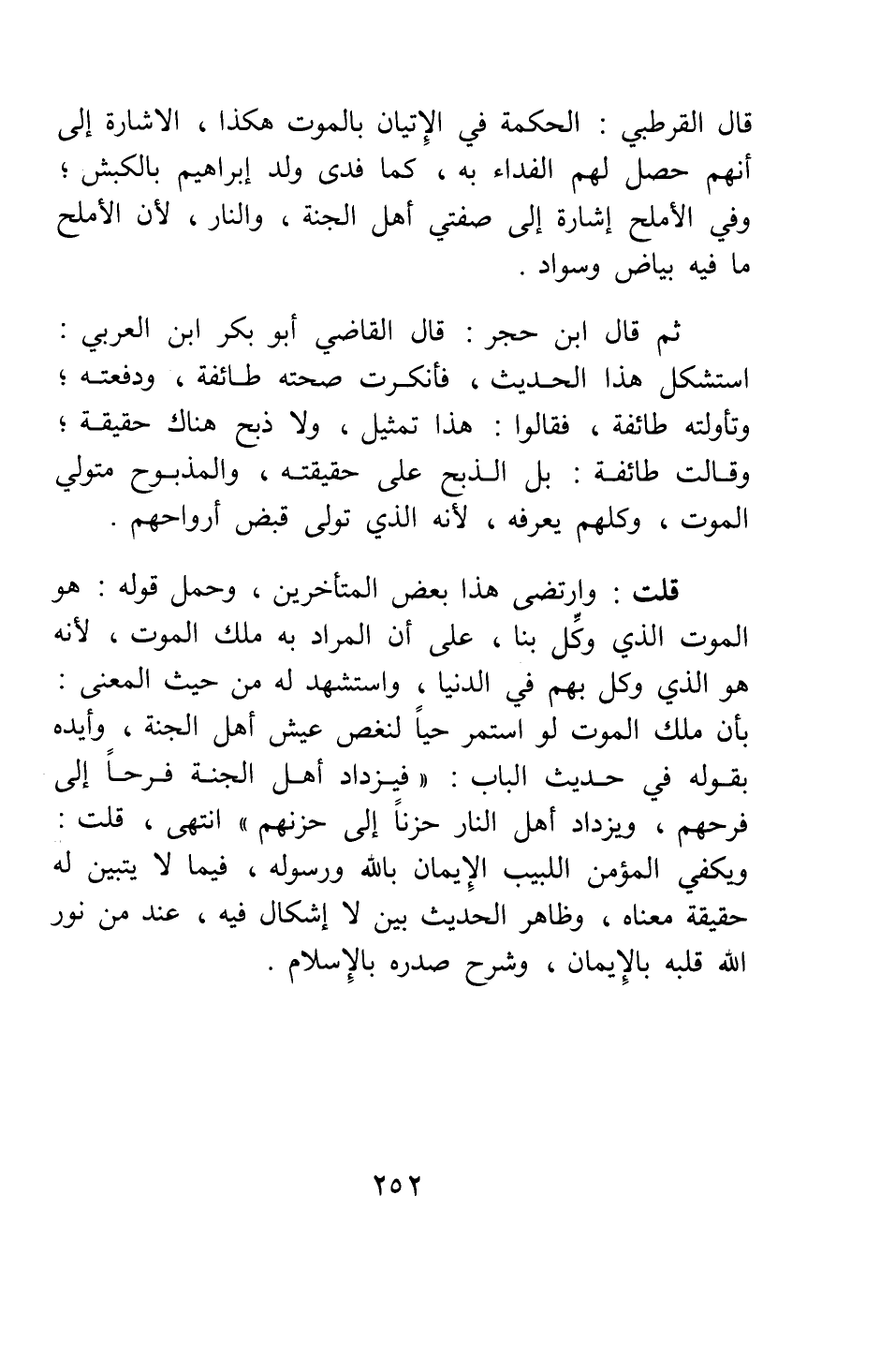 قلت: وارتضى هذا بعض المتأخرين، وحمل قوله: هو الموت الذي وكل بنا، على أن المراد به ملك الموت، لأنه هو الذي وكل بهم في الدنيا، واستشهد له من حيث المعنى: بأن ملك الموت لو استمر حيا لنغص عيش أهل الجنة، وأيده بقوله في حديث الباب: " فيزداد أهل الجنة فرحا إلى فرحهم، ويزداد أهل النار حزنا إلى حزنهم " 1 انتهى، قلت: ويكفي المؤمن اللبيب الإيمان بالله ورسوله فيما لا يتبين له حقيقة معناه، وظاهر الحديث بين لا إشكال فيه، عند من نور الله قلبه بالإيمان، وشرح صدره بالإسلام.