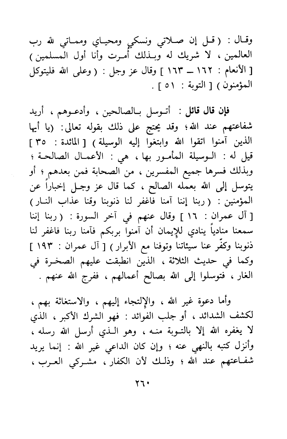 فإن قال قائل: أتوسل بالصالحين، وأدعوهم، أريد شفاعتهم عند الله؛ وقد يحتج على ذلك بقوله تعالى: {يَا أَيُّهَا الَّذِينَ آمَنُوا اتَّقُوا اللَّهَ وَابْتَغُوا إِلَيْهِ الْوَسِيلَةَ} [سورة المائدة آية: 35] ؛ قيل له: الوسيلة المأمور بها هي الأعمال الصالحة، وبذلك فسرها جميع المفسرين من الصحابة فمن بعدهم ; أو يتوسل إلى الله بعمله الصالح، كما قال عز وجل إخبارا عن المؤمنين: {رَبَّنَا إِنَّنَا آمَنَّا فَاغْفِرْ لَنَا ذُنُوبَنَا وَقِنَا عَذَابَ النَّارِ} [سورة آل عمران آية: 16] ، وقال عنهم في آخر السورة: {رَبَّنَا إِنَّنَا سَمِعْنَا مُنَادِياً يُنَادِي لِلإِيمَانِ أَنْ آمِنُوا بِرَبِّكُمْ فَآمَنَّا رَبَّنَا فَاغْفِرْ لَنَا ذُنُوبَنَا وَكَفِّرْ عَنَّا سَيِّئَاتِنَا وَتَوَفَّنَا مَعَ الأَبْرَارِ} [سورة آل عمران آية: 193] ، وكما في حديث الثلاثة، الذين انطبقت عليهم الصخرة في الغار، فتوسلوا إلى الله بصالح أعمالهم، ففرج الله عنهم.