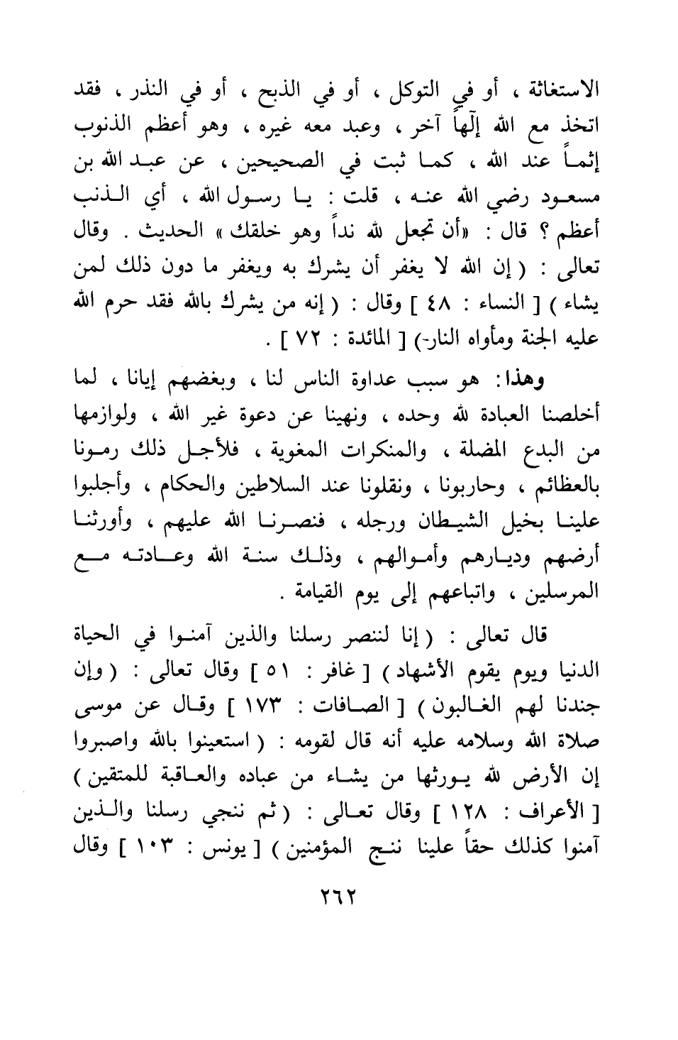 الاستغاثة، أو في التوكل، أو في الذبح، أو في النذر، فقد اتخذ مع الله إلها آخر، وعبد معه غيره، وهو أعظم الذنوب إثما عند الله، كما ثبت في الصحيحين عن عبد الله بن مسعود رضي الله عنه قلت: يا رسول الله، أي الذنب أعظم؟ قال: " أن تجعل لله ندا وهو خلقك " 1 الحديث. وقال تعالى: {إِنَّ اللَّهَ لا يَغْفِرُ أَنْ يُشْرَكَ بِهِ وَيَغْفِرُ مَا دُونَ ذَلِكَ لِمَنْ يَشَاءُ} [سورة النساء آية: 48] . وقال: {إِنَّهُ مَنْ يُشْرِكْ بِاللَّهِ فَقَدْ حَرَّمَ اللَّهُ عَلَيْهِ الْجَنَّةَ وَمَأْوَاهُ النَّارُ} [سورة المائدة آية: 72] . وهذا هو سبب عداوة الناس لنا، وبغضهم إيانا، لما أخلصنا العبادة لله وحده، ونهينا عن دعوة غير الله، ولوازمها من البدع المضلة، والمنكرات اللغوية، فلأجل ذلك رمونا بالعظائم، وحاربونا، ونقلونا عند السلاطين والحكام، وأجلبوا علينا بخيل الشيطان ورجله، فنصرنا الله عليهم، وأورثنا أرضهم وديارهم وأموالهم، وذلك سنة الله وعادته مع المرسلين، وأتباعهم إلى يوم القيامة. قال تعالى: {إِنَّا لَنَنْصُرُ رُسُلَنَا وَالَّذِينَ آمَنُوا فِي الْحَيَاةِ الدُّنْيَا وَيَوْمَ يَقُومُ الأَشْهَادُ} [سورة غافر آية: 51] ، وقال تعالى: {وَإِنَّ جُنْدَنَا لَهُمُ الْغَالِبُونَ} [سورة الصافات آية: 173] ، وقال عن موسى صلاة الله وسلامه عليه أنه قال لقومه: {اسْتَعِينُوا بِاللَّهِ وَاصْبِرُوا إِنَّ الأَرْضَ لِلَّهِ يُورِثُهَا مَنْ يَشَاءُ مِنْ عِبَادِهِ وَالْعَاقِبَةُ لِلْمُتَّقِينَ} [سورة الأعراف آية: 128] ، وقال تعالى: {ثُمَّ نُنَجِّي رُسُلَنَا وَالَّذِينَ آمَنُوا كَذَلِكَ حَقّاً عَلَيْنَا نُنْجِ الْمُؤْمِنِينَ} [سورة يونس آية: 103] ، وقال