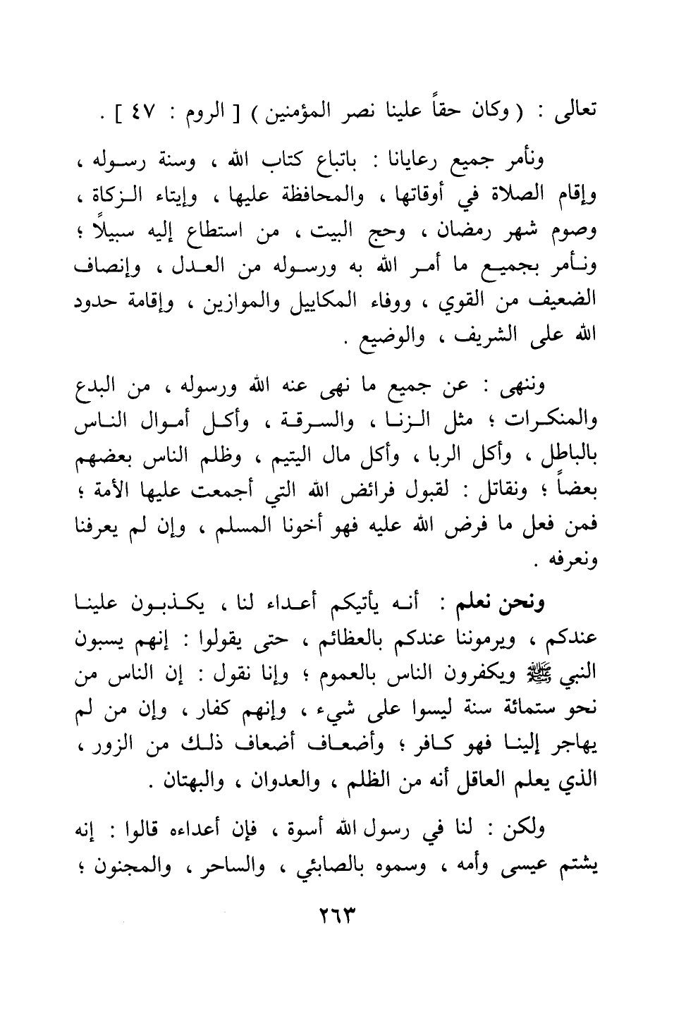وننهى عن جميع ما نهى عنه الله ورسوله، من البدع والمنكرات، مثل الزنى، والسرقة، وأكل أموال الناس بالباطل، وأكل الربا، وأكل مال اليتيم، وظلم الناس بعضهم بعضا، ونقاتل لقبول فرائض الله التي أجمعت عليها الأمة، فمن فعل ما فرض الله عليه فهو أخونا المسلم، وإن لم يعرفنا ونعرفه.