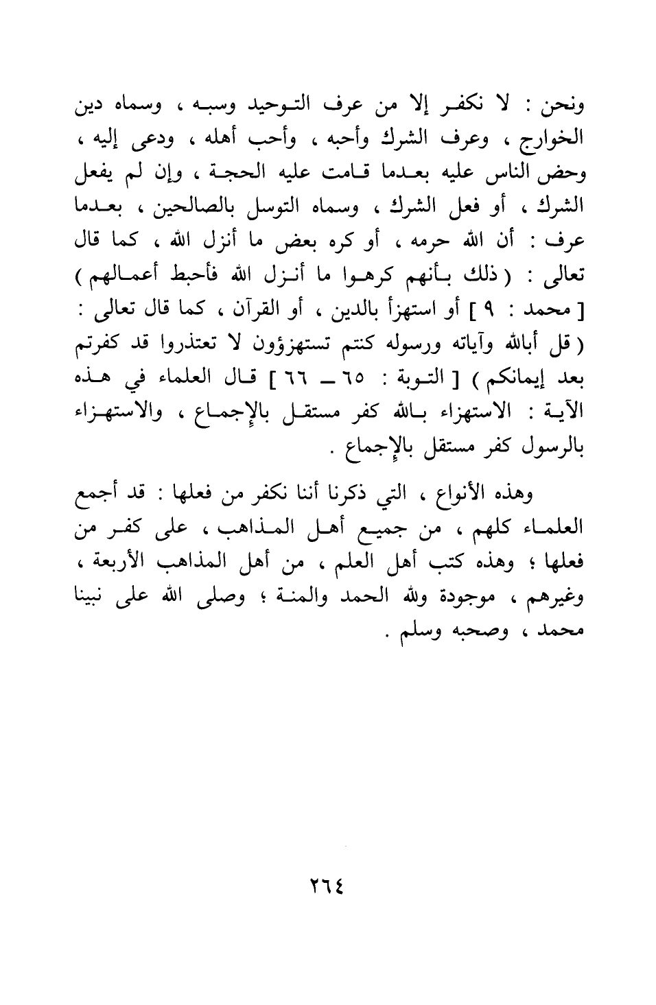 ونحن لا نكفر إلا من عرف التوحيد وسبه، وسماه دين الخوارج، وعرف الشرك وأحبه، وأهله، ودعى إليه، وحض الناس عليه بعدما قامت عليه الحجة، وإن لم يفعل الشرك، أو فعل الشرك، وسماه التوسل بالصالحين، بعدما عرف أن الله حرمه، أو كره بعض ما أنزل الله، كما قال تعالى: {ذَلِكَ بِأَنَّهُمْ كَرِهُوا مَا أَنْزَلَ اللَّهُ فَأَحْبَطَ أَعْمَالَهُمْ} [سورة محمد آية: 9] ، أو استهزأ بالدين، أو القرآن، كما قال تعالى: {قُلْ أَبِاللَّهِ وَآيَاتِهِ وَرَسُولِهِ كُنْتُمْ تَسْتَهْزِئُونَ لا تَعْتَذِرُوا قَدْ كَفَرْتُمْ بَعْدَ إِيمَانِكُمْ} [سورة التوبة آية: 65-66] ، قال العلماء في هذه الآية: الاستهزاء بالله كفر مستقل بالإجماع، والاستهزاء بالرسول كفر مستقل بالإجماع.