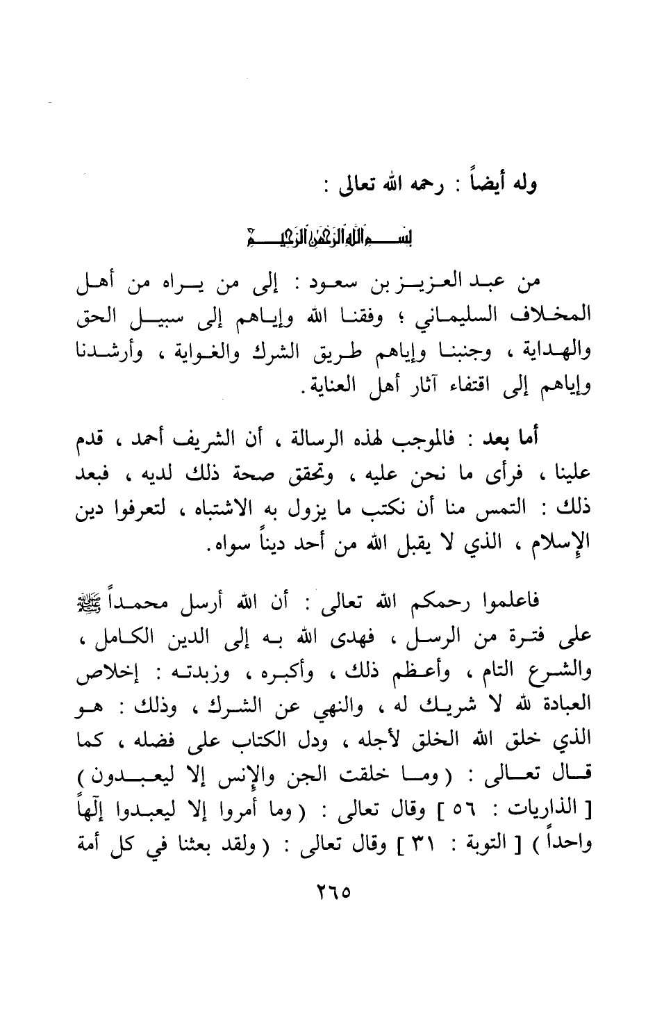 أما بعد: فالموجب لهذه الرسالة أن الشريف أحمد قدم علينا فرأى ما نحن عليه، وتحقق صحة ذلك لديه، فبعد ذلك التمس منا أن نكتب ما يزول به الاشتباه، لتعرفوا دين الإسلام، الذي لا يقبل الله من أحد دينا سواه.