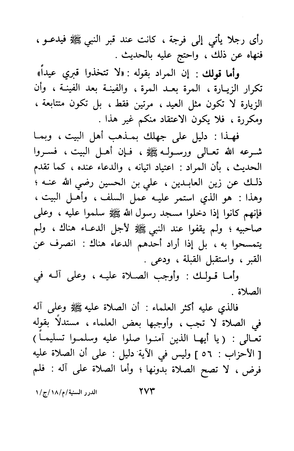 وأما قولك: إن المراد بقوله: " لا تتخذوا قبري عيدا " 1 تكرار الزيارة، المرة بعد المرة، والفينة بعد الفينة، وأن الزيارة لا تكون مثل العيد، مرتين فقط، بل تكون متتابعة، ومكررة، فلا يكون الاعتقاد منكم غير هذا.