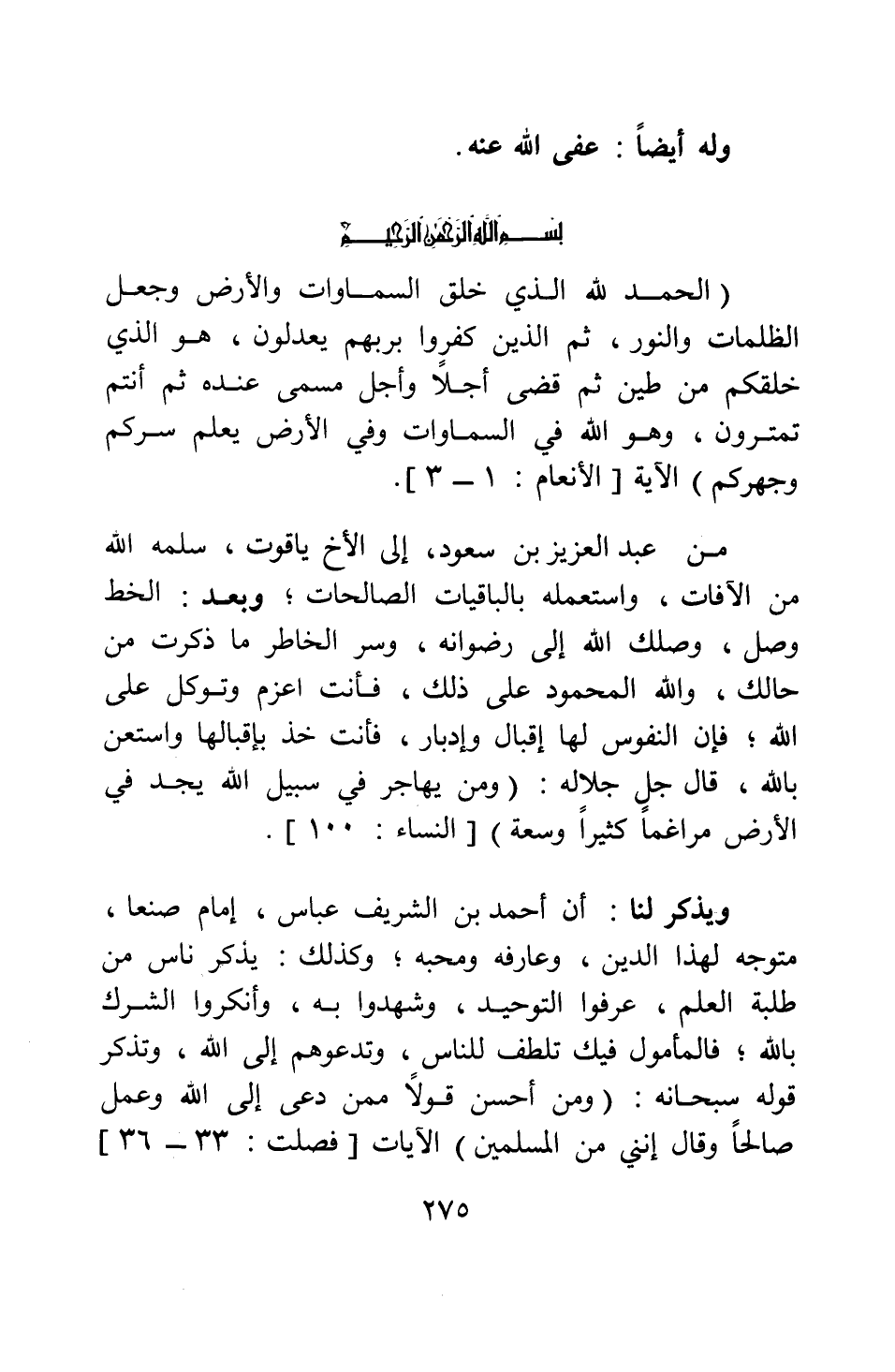 ويذكر لنا أن أحمد بن الشريف عباس، إمام صنعاء، متوجه لهذا الدين، وعارفه ومحبه، وكذلك يذكر ناس من طلبة العلم، عرفوا التوحيد، وشهدوا به، وأنكروا الشرك بالله، فالمأمول فيك تلطف للناس، وتدعوهم إلى الله، وتذكر قوله سبحانه: {وَمَنْ أَحْسَنُ قَوْلاً مِمَّنْ دَعَا إِلَى اللَّهِ وَعَمِلَ صَالِحاً وَقَالَ إِنَّنِي مِنَ الْمُسْلِمِينَ} الآيات [سورة فصلت آية: 33-36] .