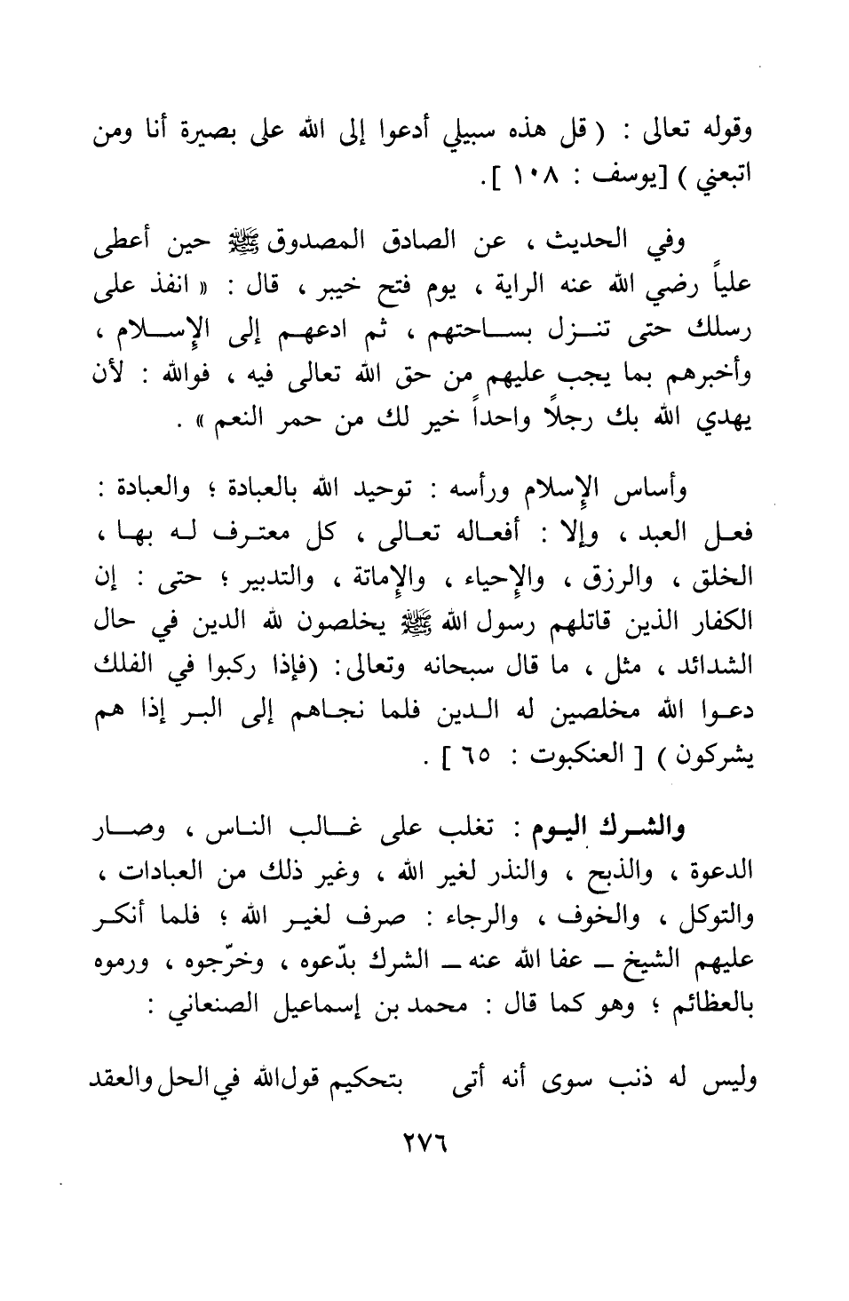 والشرك اليوم تغلب على غالب الناس، وصار الدعوة، والذبح، والنذر لغير الله، وغير ذلك من العبادات، والتوكل، والخوف، والرجاء صرف لغير الله. فلما أنكر عليهم الشيخ- عفا الله عنه- الشرك بدّعوه، وخرّجوه، ورموه بالعظائم، وهو كما قال محمد بن إسماعيل الصنعاني: