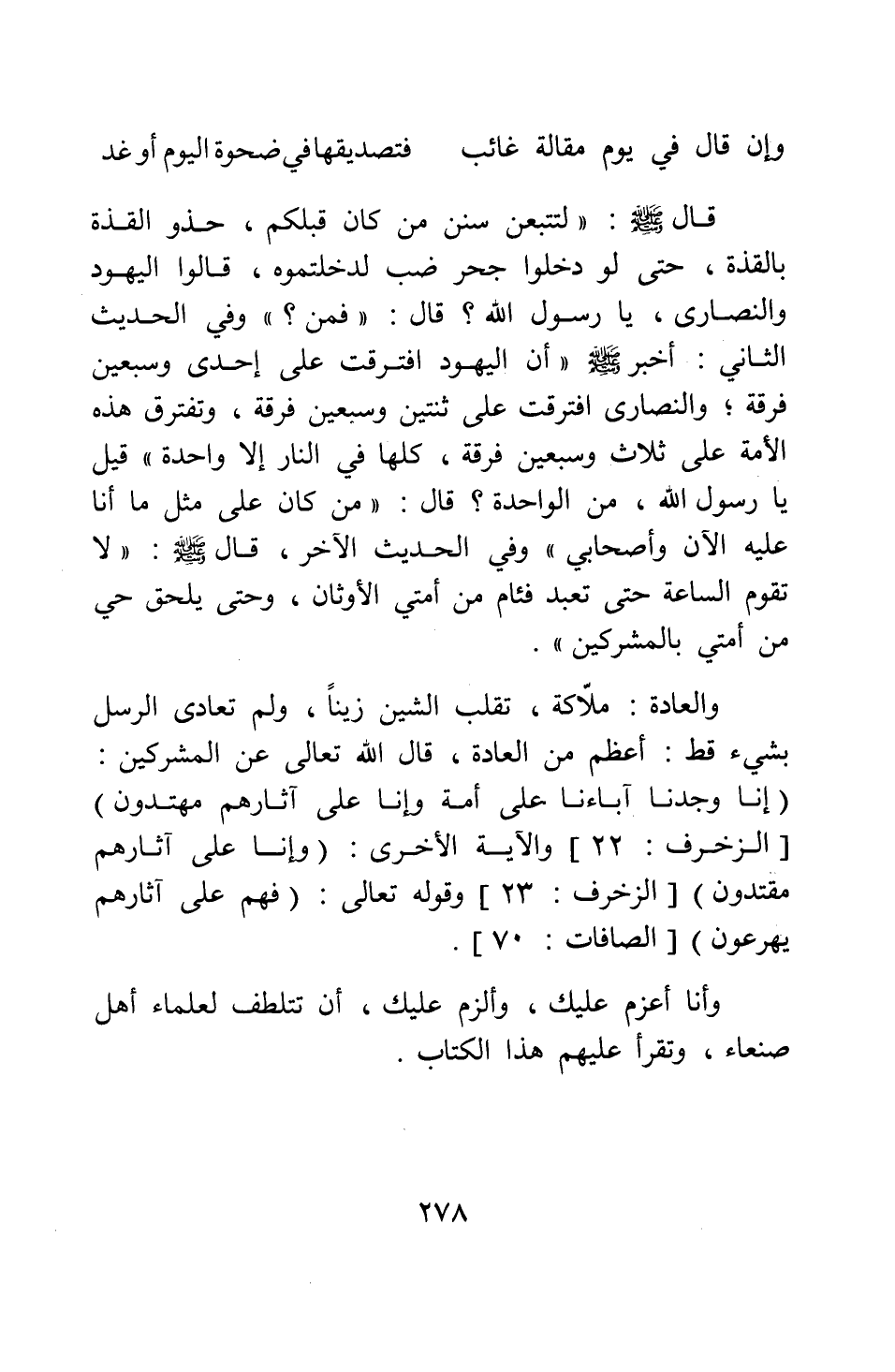 والعادة ملاكة، تقلب الشين زينا، ولم تعادى الرسل بشيء قط أعظم من العادة، قال الله تعالى عن المشركين: {إِنَّا وَجَدْنَا آبَاءَنَا عَلَى أُمَّةٍ وَإِنَّا عَلَى آثَارِهِمْ مُهْتَدُونَ} [سورة الزخرف آية: 22] ، والآية الأخرى: {وَإِنَّا عَلَى آثَارِهِمْ مُقْتَدُونَ} [سورة الزخرف آية: 23] ، وقوله تعالى: {فَهُمْ عَلَى آثَارِهِمْ يُهْرَعُونَ} [سورة الصافات آية: 70] . وأنا أعزم عليك، وألزم عليك، أن تتلطف لعلماء أهل صنعاء، وتقرأ عليهم هذا الكتاب.
