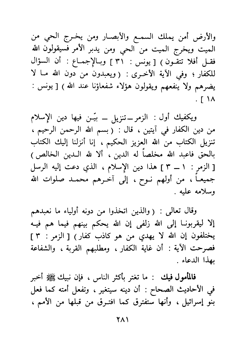 ويكفيك أول الزمر - تنْزيل - بين فيها دين الإسلام من دين الكفار في آيتين، قال: بسم الله الرحمن الرحيم {تَنْزِيلُ الْكِتَابِ مِنَ اللَّهِ الْعَزِيزِ الْحَكِيمِ إِنَّا أَنْزَلْنَا إِلَيْكَ الْكِتَابَ بِالْحَقِّ فَاعْبُدِ اللَّهَ مُخْلِصاً لَهُ الدِّينَ أَلا لِلَّهِ الدِّينُ الْخَالِصُ} [سورة آية: 1-2-3] : هذا دين الإسلام الذي دعت إليه الرسل جميعا، من أولهم نوح إلى آخرهم محمد صلوات الله وسلامه عليه.