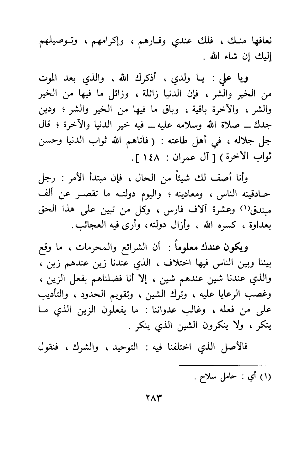 ويا علي، يا ولدي، أذكرك الله والذي بعد الموت من الخير والشر، فإن الدنيا زائلة وزائل ما فيها من الخير والشر، والآخرة باقية وباق ما فيها من الخير والشر، ودين جدك - صلاة الله وسلامه عليه - فيه خير الدنيا والآخرة، قال جل جلاله في أهل طاعته: {فَآتَاهُمُ اللَّهُ ثَوَابَ الدُّنْيَا وَحُسْنَ ثَوَابِ الآخِرَةِ} [سورة آل عمران آية: 148] .