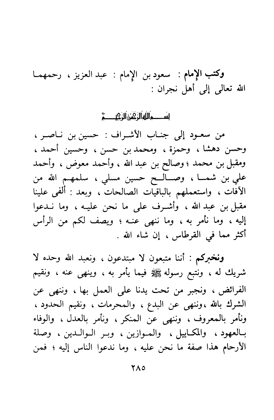 وكتب الإمام سعود بن الإمام عبد العزيز، رحمهما الله تعالى إلى أهل نجران: