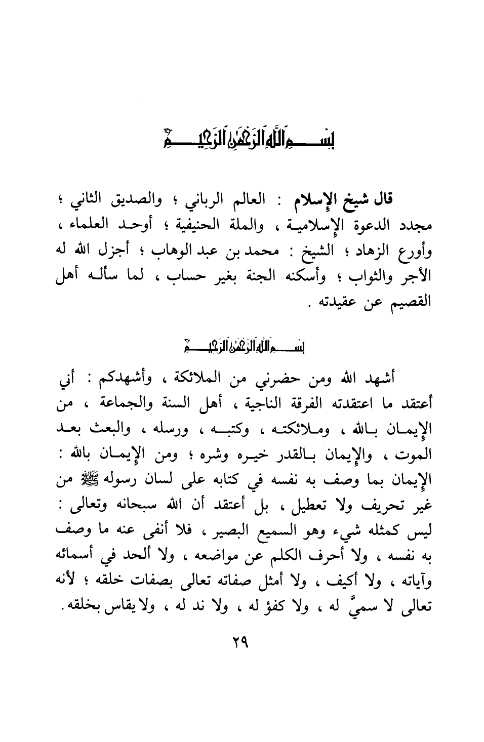 أشهد الله ومن حضرني من الملائكة، وأشهدكم: أني أعتقد ما اعتقدته الفرقة الناجية، أهل السنة والجماعة، من الإيمان بالله، وملائكته، وكتبه، ورسله، والبعث بعد الموت، والإيمان بالقدر خيره وشره، ومن الإيمان بالله: الإيمان بما وصف به نفسه في كتابه على لسان رسوله صلى الله عليه وسلم، من غير تحريف ولا تعطيل، بل أعتقد أن الله سبحانه وتعالى ليس كمثله شيء وهو السميع البصير؛ فلا أنفي عنه ما وصف به نفسه، ولا أحرف الكلم عن مواضعه، ولا ألحد في أسمائه وآياته، ولا أكيف، ولا أمثل صفاته تعالى بصفات خلقه; لأنه تعالى لا سمي له، ولا كفؤ له، ولا ند له، ولا يقاس بخلقه.