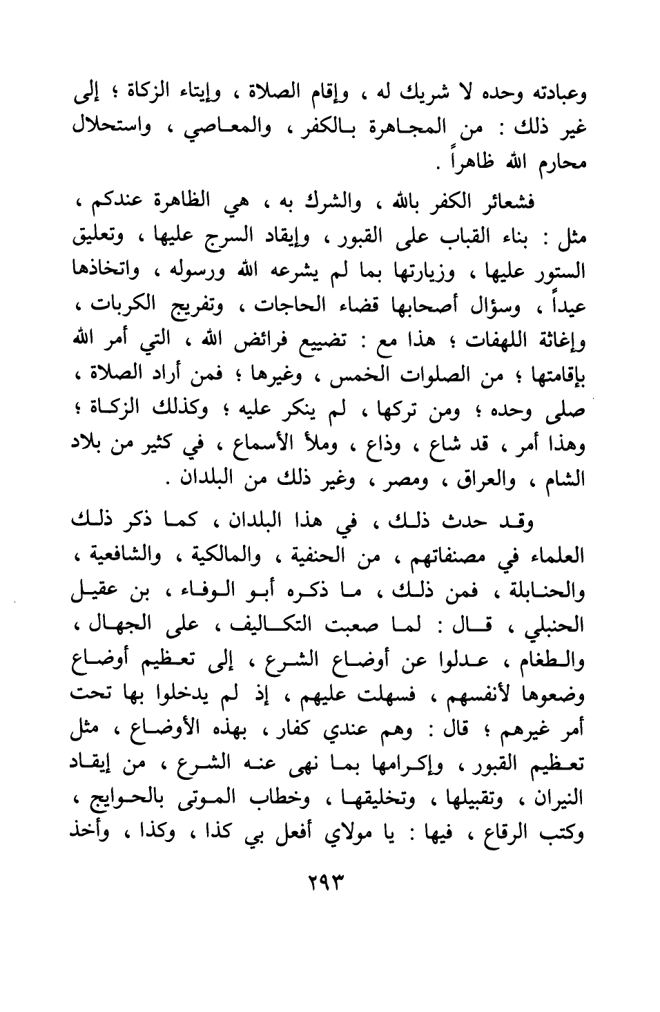 فشعائر الكفر بالله، والشرك به، هي الظاهرة عندكم، مثل بناء القباب على القبور، وإيقاد السرج عليها، وتعليق الستور عليها، وزيارتها بما لم يشرعه الله ورسوله، واتخاذها عيدا، وسؤال أصحابها قضاء الحاجات، وتفريج الكربات، وإغاثة اللهفات، هذا مع تضييع فرائض الله التي أمر الله بإقامتها، من الصلوات الخمس، وغيرها، فمن أراد الصلاة صلى وحده، ومن تركها لم ينكر عليه، وكذلك الزكاة ; وهذا أمر، قد شاع، وذاع، وملأ الأسماع، في كثير من بلاد الشام، والعراق، ومصر، وغير ذلك من البلدان.