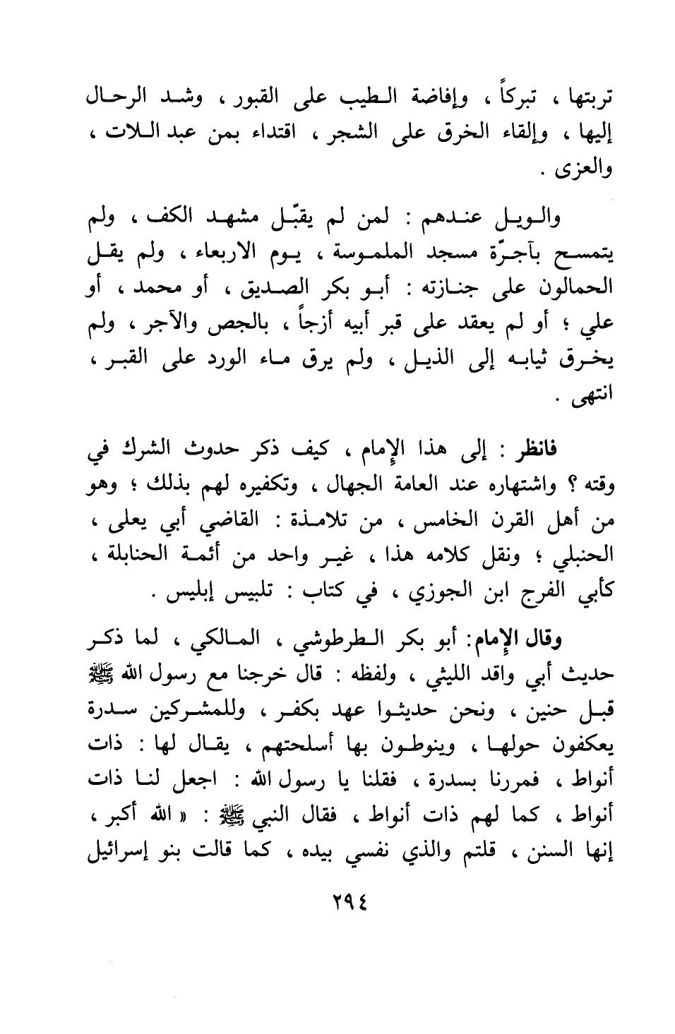 وقال الإمام أبو بكر الطرطوشي المالكي، لما ذكر حديث أبي واقد الليثي، ولفظه: قال: " خرجنا مع رسول الله صلى الله عليه وسلم قبل حنين، ونحن حديثو عهد بكفر، وللمشركين سدرة يعكفون حولها، وينوطون بها أسلحتهم، يقال لها: ذات أنواط، فمررنا بسدرة، فقلنا: يا رسول الله، اجعل لنا ذات أنواط، كما لهم ذات أنواط. فقال النبي صلى الله عليه وسلم: الله أكبر، إنها السنن، قلتم - والذي نفسي بيده - كما قالت بنو إسرائيل