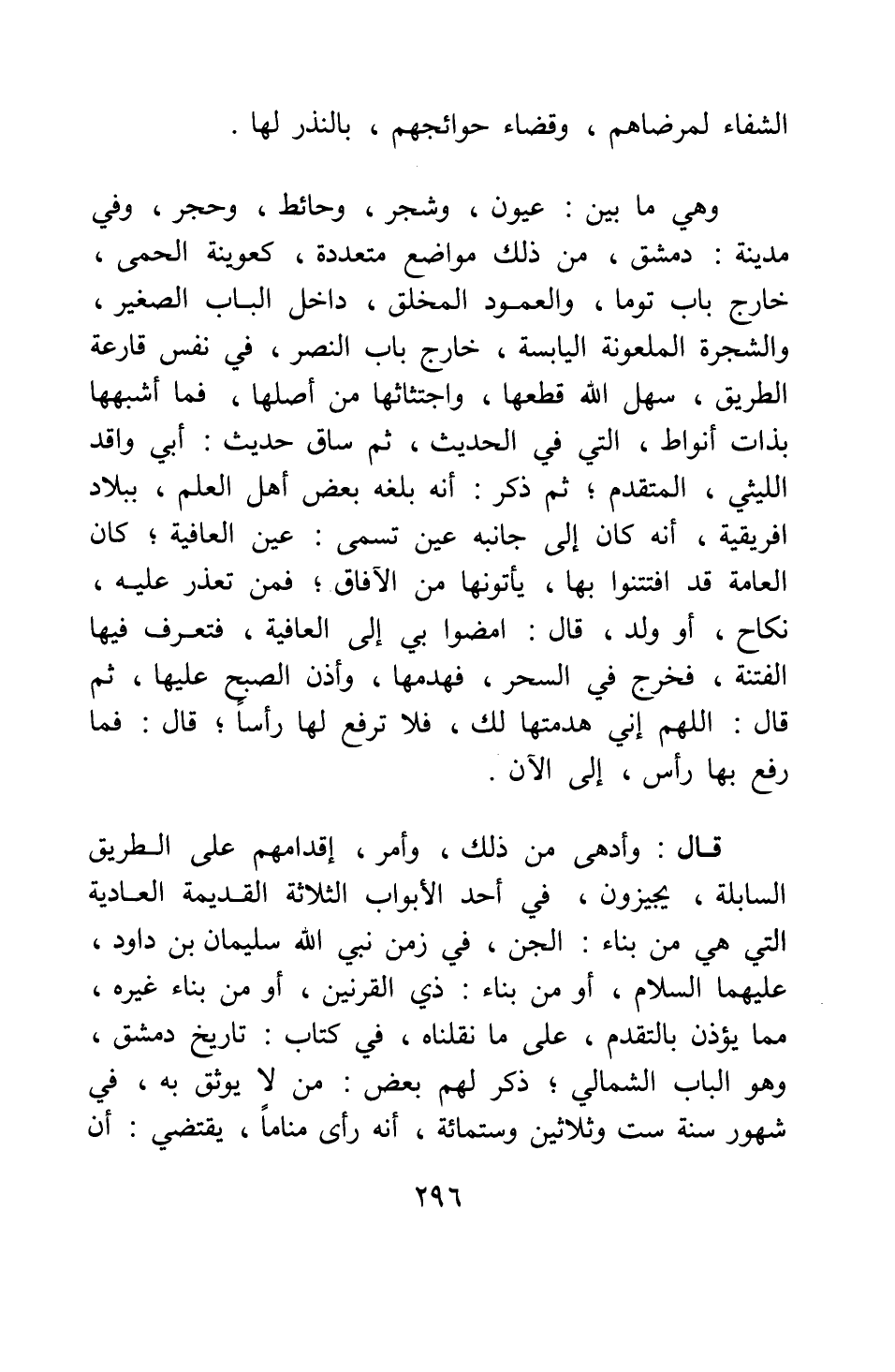 قال: وأدهى من ذلك وأمر إقدامهم على الطريق السابلة يجيزون في أحد الأبواب الثلاثة القديمة العادية التي هي من بناء الجن، في زمن نبي الله سليمان بن داود عليهما السلام، أو من بناء ذي القرنين، أو من بناء غيره، مما يؤذن بالتقدم، على ما نقلناه في كتاب تاريخ دمشق، وهو الباب الشمالي ; ذكر لهم بعض من لا يوثق به، في شهور سنة ست وثلاثين وستمائة، أنه رأى مناما يقتضي أن