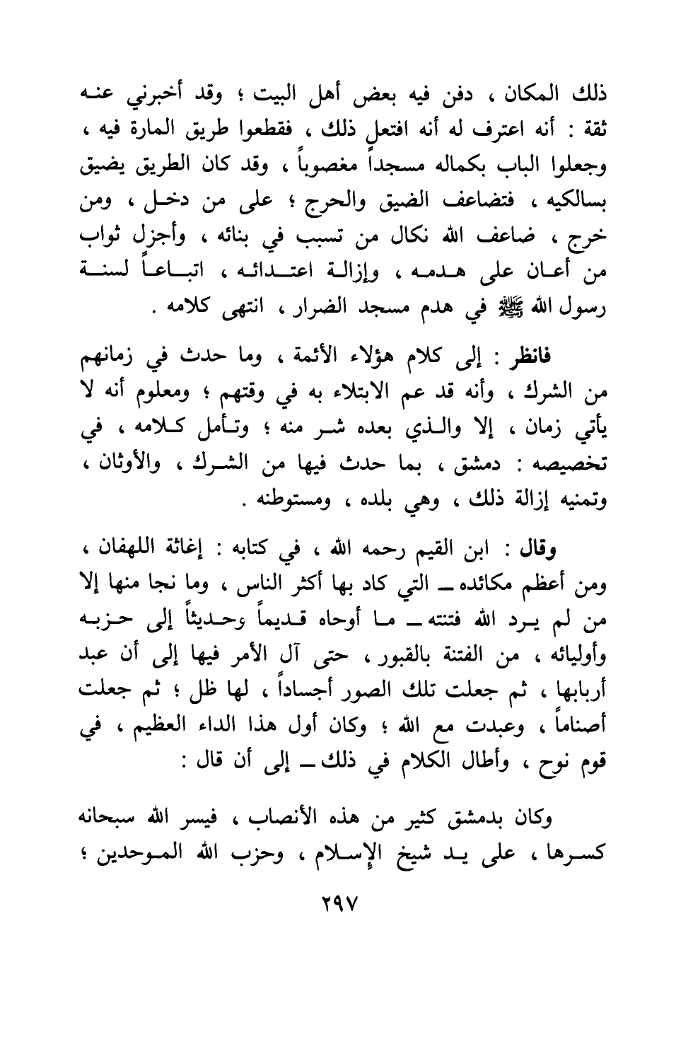 ذلك المكان دفن فيه بعض أهل البيت، وقد أخبرني عنه ثقة أنه اعترف له أنه افتعل ذلك، فقطعوا طريق المارة فيه، وجعلوا الباب بكماله مسجدا مغصوبا، وقد كان الطريق يضيق بسالكيه، فتضاعف الضيق والحرج، على من دخل ومن خرج، ضاعف الله نكال من تسبب في بنائه، وأجزل ثواب من أعان على هدمه، وإزالة اعتدائه، اتباعا لسنة رسول الله صلى الله عليه وسلم في هدم مسجد الضرار، انتهى كلامه.