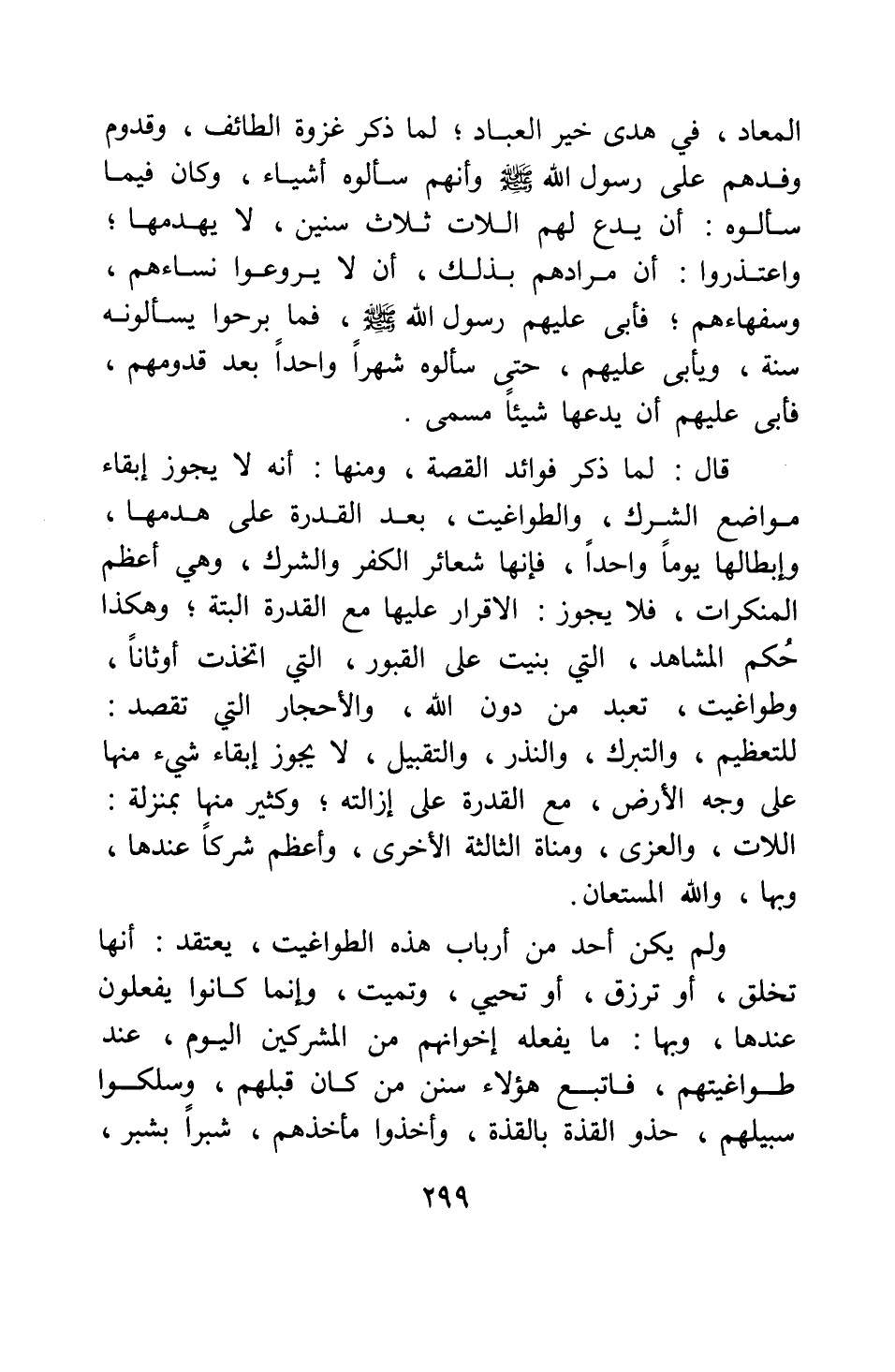 المعاد في هدى خير العباد ; لما ذكر غزوة الطائف، وقدوم وفدهم على رسول الله صلى الله عليه وسلم وأنهم سألوه أشياء، وكان فيما سألوه: أن يدع لهم اللات ثلاث سنين لا يهدمها، واعتذروا أن مرادهم بذلك أن لا يروعوا نساءهم وسفهاءهم، فأبى عليهم رسول الله صلى الله عليه وسلم فما برحوا يسألونه سنة، ويأبى عليهم، حتى سألوه شهرا واحدا بعد قدومهم، فأبى عليهم أن يدعها شيئا مسمى.
