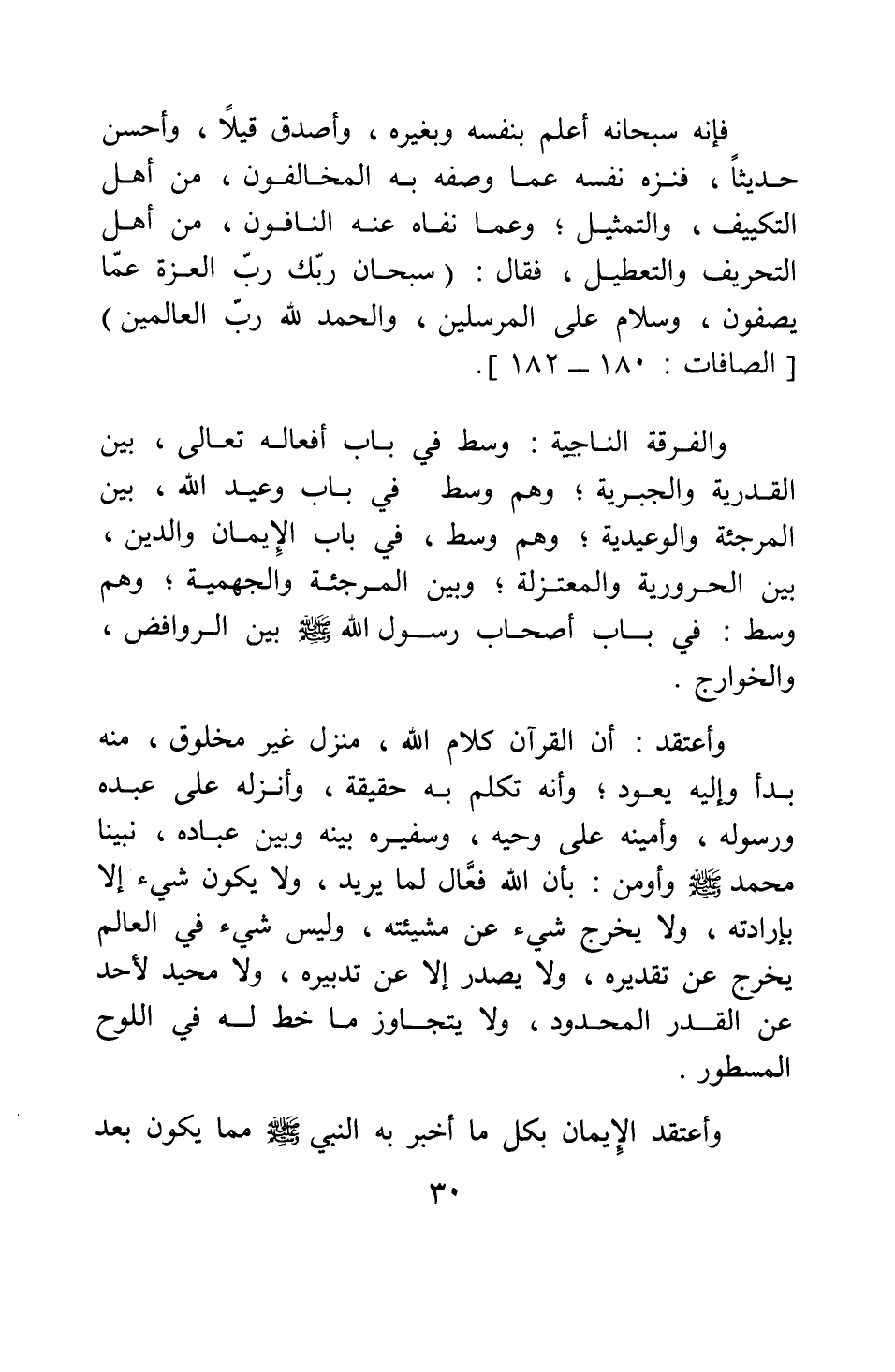 وأعتقد: أن القرآن كلام الله، منْزل غير مخلوق، منه بدأ وإليه يعود ; وأنه تكلم به حقيقة، وأنزله على عبده ورسوله، وأمينه على وحيه، وسفيره بينه وبين عباده، نبينا محمد صلى الله عليه وسلم. وأؤمن: بأن الله فعال لما يريد، ولا يكون شيء إلا بإرادته، ولا يخرج شيء عن مشيئته، وليس شيء في العالم يخرج عن تقديره، ولا يصدر إلا عن تدبيره، ولا محيد لأحد عن القدر المحدود، ولا يتجاوز ما خط له في اللوح المسطور.