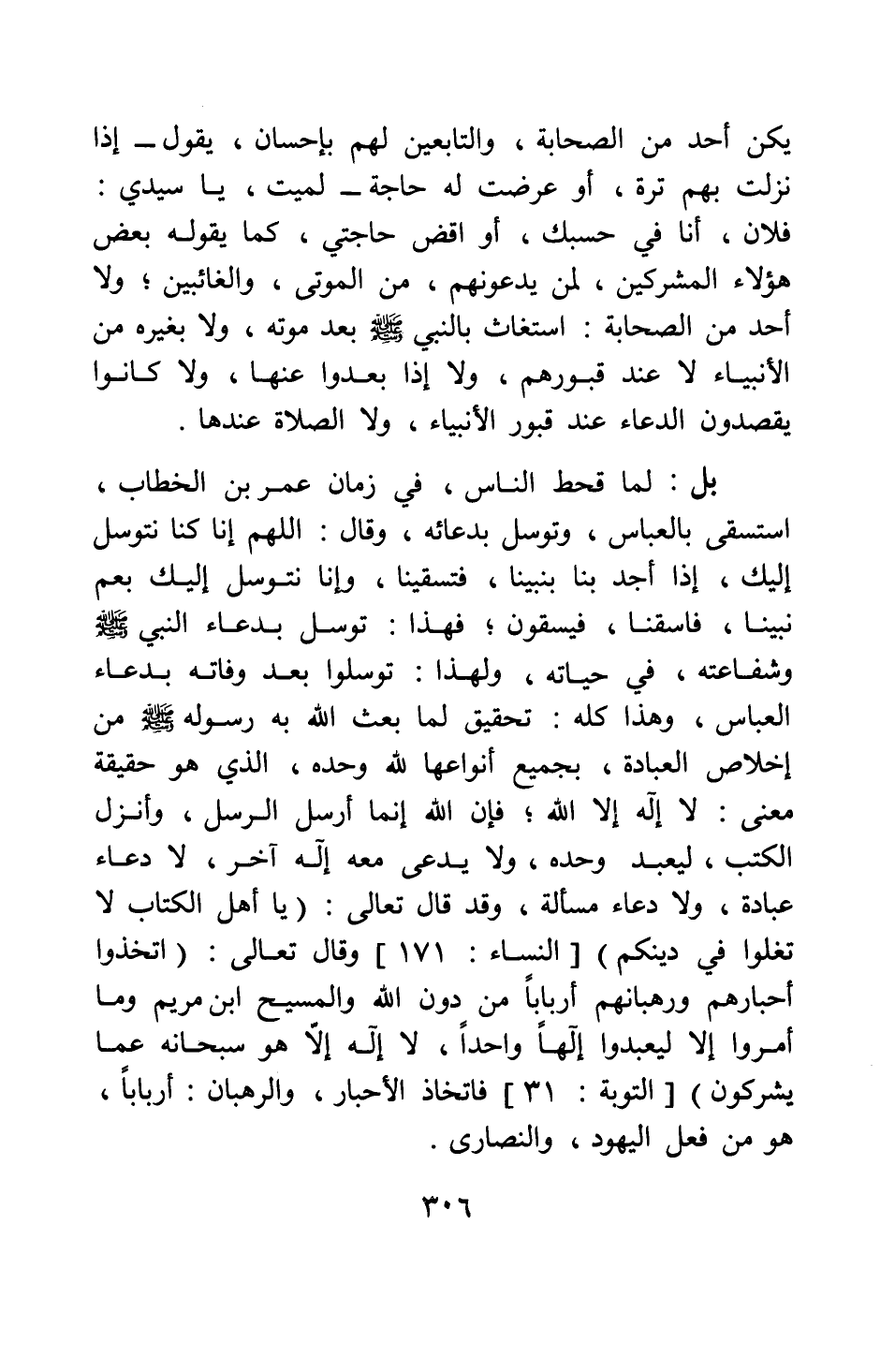 يكن أحد من الصحابة والتابعين لهم بإحسان، يقول - إذا نزلت بهم ترة، أو عرضت له حاجة – لميت: يا سيدي فلان، أنا في حسبك، أو اقض حاجتي، كما يقوله بعض هؤلاء المشركين لمن يدعونهم من الموتى والغائبين; ولا أحد من الصحابة استغاث بالنبي صلى الله عليه وسلم بعد موته، ولا بغيره من الأنبياء لا عند قبورهم، ولا إذا بعدوا عنها، ولا كانوا يقصدون الدعاء عند قبور الأنبياء، ولا الصلاة عندها؛ بل: " لما قحط الناس، في زمان عمر بن الخطاب، استسقى بالعباس، وتوسل بدعائه، وقال: اللهم إنا كنا نتوسل إليك، إذا أجدبنا بنبينا، فتسقينا، وإنا نتوسل إليك بعم نبينا، فاسقنا، فيسقون ". فهذا توسل بدعاء النبي صلى الله عليه وسلم وشفاعته في حياته، ولهذا: توسلوا بعد وفاته بدعاء العباس. وهذا كله تحقيق لما بعث الله به رسوله صلى الله عليه وسلم من إخلاص العبادة بجميع أنواعها لله وحده، الذي هو حقيقة معنى لا إله إلا الله; فإن الله إنما أرسل الرسل، وأنزل الكتب، ليعبد وحده، ولا يدعى معه إله آخر، لا دعاء عبادة، ولا دعاء مسألة، وقد قال تعالى: {يَا أَهْلَ الْكِتَابِ لا تَغْلُوا فِي دِينِكُمْ} [سورة النساء آية: 171] ، وقال تعالى: {اتَّخَذُوا أَحْبَارَهُمْ وَرُهْبَانَهُمْ أَرْبَاباً مِنْ دُونِ اللَّهِ وَالْمَسِيحَ ابْنَ مَرْيَمَ وَمَا أُمِرُوا إِلاَّ لِيَعْبُدُوا إِلَهاً وَاحِداً لا إِلَهَ إِلاَّ هُوَ سُبْحَانَهُ عَمَّا يُشْرِكُونَ} [سورة التوبة آية: 31] . فاتخاذ الأحبار، والرهبان أربابا، هو من فعل اليهود، والنصارى.