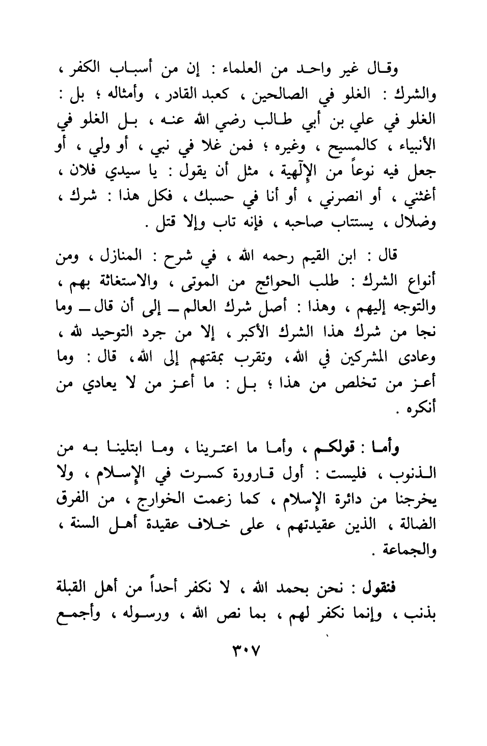 فنقول: نحن بحمد الله، لا نكفر أحدا من أهل القبلة بذنب، وإنما نكفر لهم، بما نص الله ورسوله، وأجمع