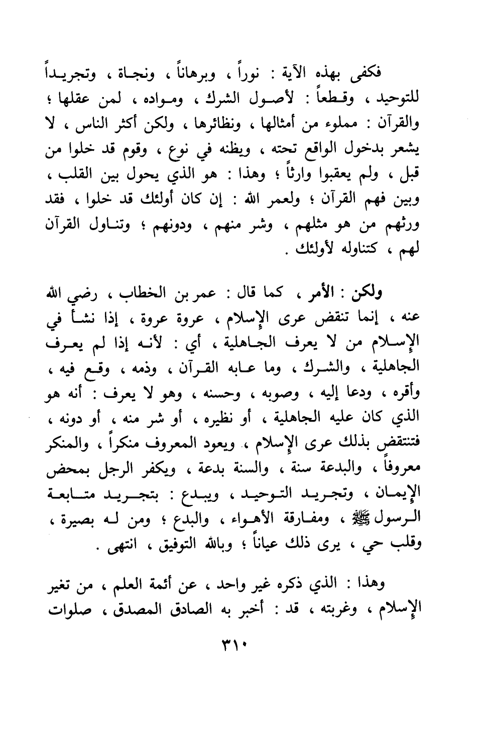 فكفى بهذه الآية ورا، وبرهانا، ونجاة، وتجريدا للتوحيد، وقطعا لأصول الشرك ومواده، لمن عقلها; والقرآن مملوء من أمثالها، ونظائرها، ولكن أكثر الناس لا يشعر بدخول الواقع تحته، ويظنه في نوع وقوم قد خلوا من قبل، ولم يعقبوا وارثا; وهذا هو الذي يحول بين القلب وبين فهم القرآن; ولعمر الله إن كان أولئك قد خلوا، فقد ورثهم من هو مثلهم، وشر منهم، ودونهم، وتناول القرآن لهم، كتناوله لأولئك؛ ولكن: الأمركما قال عمر بن الخطاب، رضي الله عنه: "إنما تنقض عرى الإسلام، عروة عروة، إذا نشأ في الإسلام من لا يعرف الجاهلية " أي: لأنه إذا لم يعرف الجاهلية والشرك، وما عابه القرآن وذمه، وقع فيه وأقره، ودعا إليه، وصوبه، وحسنه، وهو لا يعرف أنه هو الذي كان عليه الجاهلية، أو نظيره، أو شر منه، أو دونه؛ فتنتقض بذلك عرى الإسلام، ويعود المعروف منكرا، والمنكر معروفا، والبدعة سنة، والسنة بدعة، ويكفر الرجل بمحض الإيمان، وتجريد التوحيد، ويبدع بتجريد متابعة الرسول صلى الله عليه وسلم ومفارقة الأهواء والبدع. ومن له بصيرة، وقلب حي، يرى ذلك عيانا; وبالله التوفيق، انتهى.