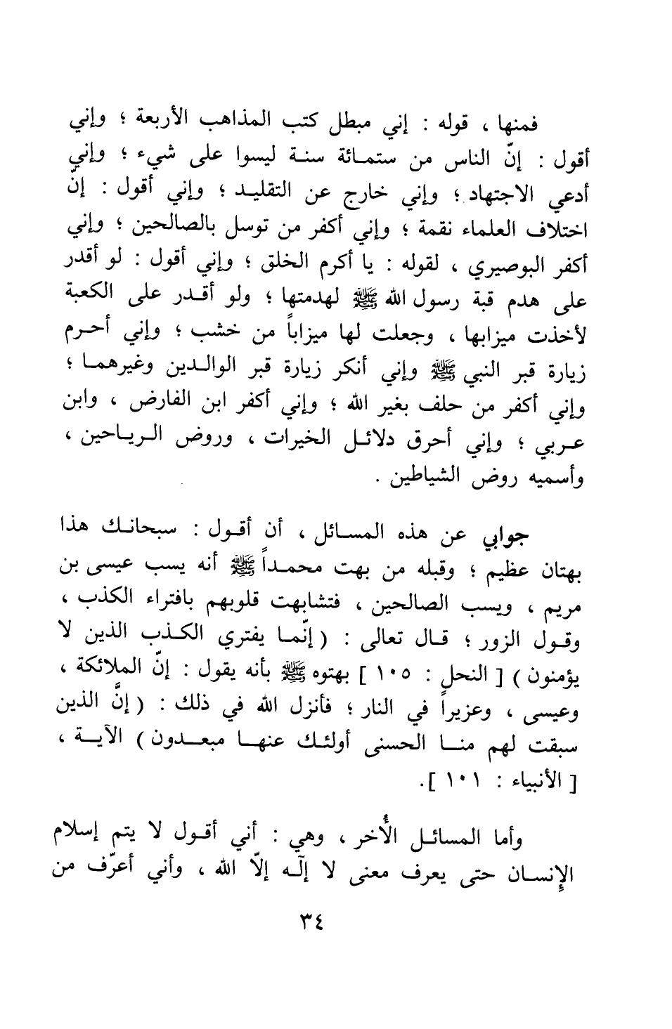 جوابي عن هذه المسائل أن أقول: سبحانك هذا بهتان عظيم; وقبله من بهت محمدا صلى الله عليه وسلم أنه يسب عيسى ابن مريم، ويسب الصالحين، فتشابهت قلوبهم بافتراء الكذب، وقول الزور; قال تعالى: {إِنَّمَا يَفْتَرِي الْكَذِبَ الَّذِينَ لا يُؤْمِنُونَ بِآياتِ اللَّهِ وَأُولَئِكَ هُمُ الْكَاذِبُونَ} ، [سورة النحل آية: 105] . بهتوه صلى الله عليه وسلم بأنه يقول: إن الملائكة، وعيسى، وعزيرا في النار; فأنزل الله في ذلك: {إِنَّ الَّذِينَ سَبَقَتْ لَهُمْ مِنَّا الْحُسْنَى أُولَئِكَ عَنْهَا مُبْعَدُونَ} ، [سورة الأنبياء آية: 101] ، وأما المسائل الأخر، وهي: أني أقول لا يتم إسلام الإنسان حتى يعرف معنى لا إله إلا الله، وأني أعرف من