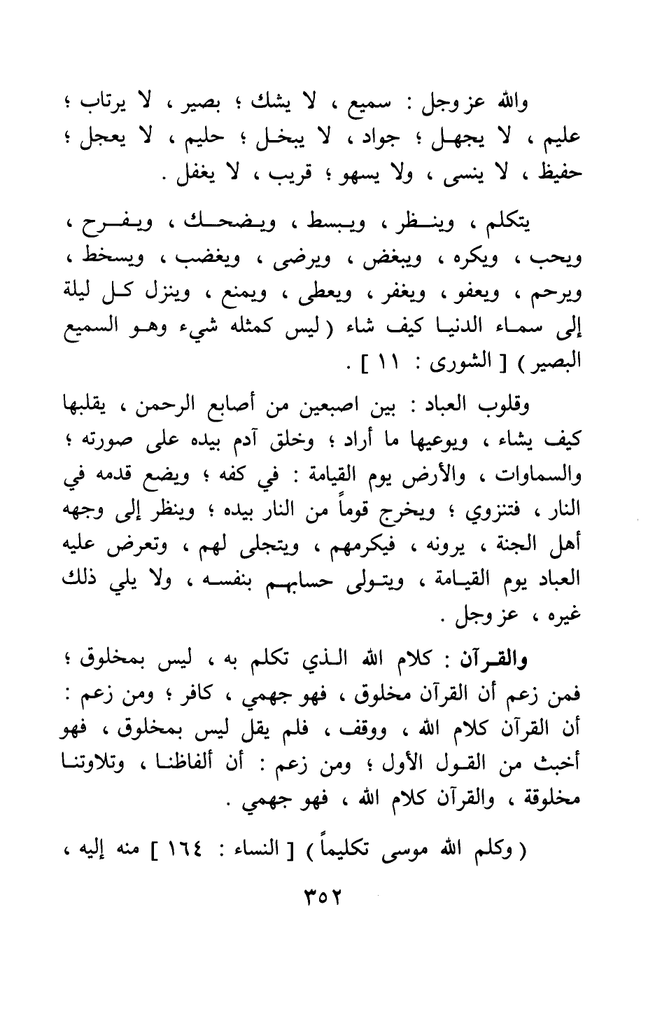 وقلوب العباد بين إصبعين من أصابع الرحمن يقلبها كيف يشاء، ويوعيها ما أراد؛ وخلق آدم بيده على صورته. والسماوات والأرض يوم القيامة في كفه؛ ويضع قدمه في النار، فتنْزوي ويخرج قوما من النار بيده. وينظر إلى وجهه أهل الجنة، يرونه، فيكرمهم، ويتجلى لهم. وتعرض عليه العباد يوم القيامة، ويتولى حسابهم بنفسه، ولا يلي ذلك غيره، عز وجل.