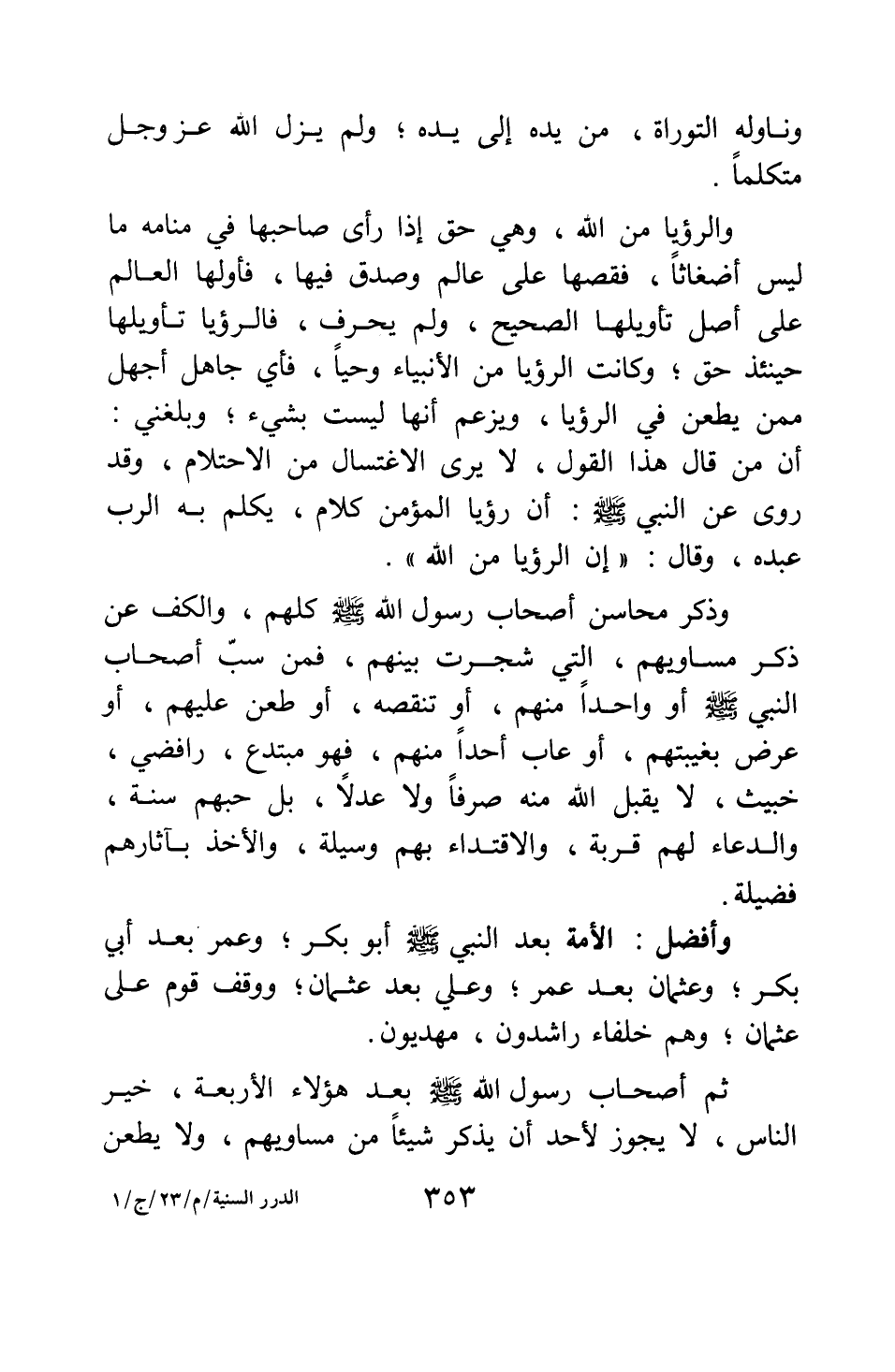 والرؤيا من الله، وهي حق إذا رأى صاحبها في منامه ما ليس أضغاثا، فقصها على عالم وصدق فيها، فأولها العالم على أصل تأويلها الصحيح، ولم يحرف؛ فالرؤيا تأويلها حينئذ حق. وكانت الرؤيا من الأنبياء وحيا، فأي جاهل أجهل ممن يطعن في الرؤيا، ويزعم أنها ليست بشيء؟ وبلغني أن من قال هذا القول، لا يرى الاغتسال من الاحتلام، وقد روي عن النبي صلى الله عليه وسلم أن رؤيا المؤمن كلام يكلم به الرب عبده، وقال: " إن الرؤيا من الله " 1.
