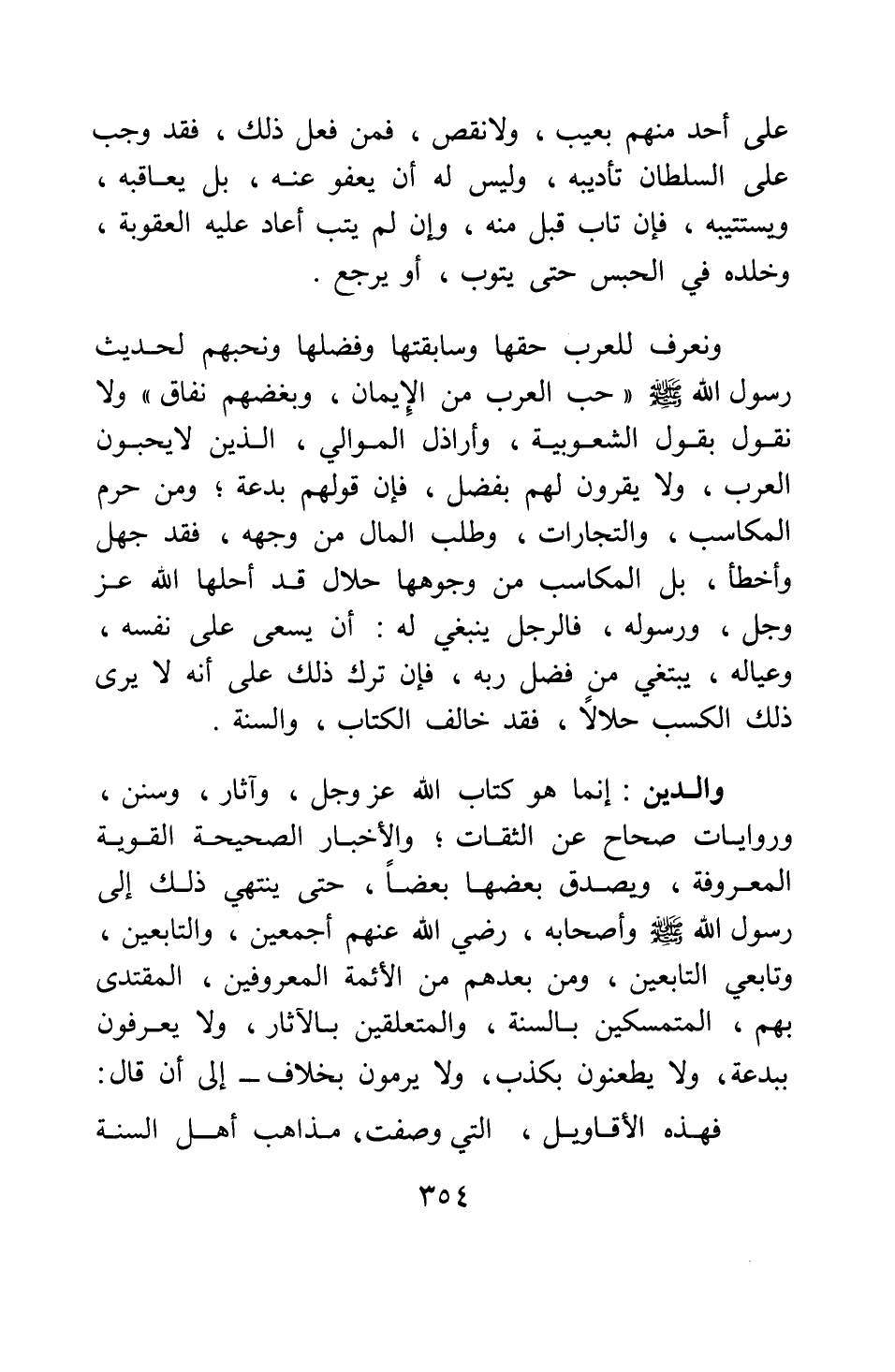 ونعرف للعرب حقها وسابقتها وفضلها، ونحبهم لحديث رسول الله صلى الله عليه وسلم: " حب العرب من الإيمان، وبغضهم نفاق "؛ ولا نقول بقول الشعوبية، وأراذل الموالي، الذين لا يحبون العرب، ولا يقرون لهم بفضل، فإن قولهم بدعة. ومن حرم المكاسب، والتجارات وطلب المال من وجهه، فقد جهل وأخطأ؛ بل المكاسب من وجوهها حلال، قد أحلها الله عز وجل ورسوله؛ فالرجل ينبغي له أن يسعى على نفسه وعياله يبتغي من فضل ربه، فإن ترك ذلك على أنه لا يرى ذلك الكسب حلالا، فقد خالف الكتاب والسنة.
