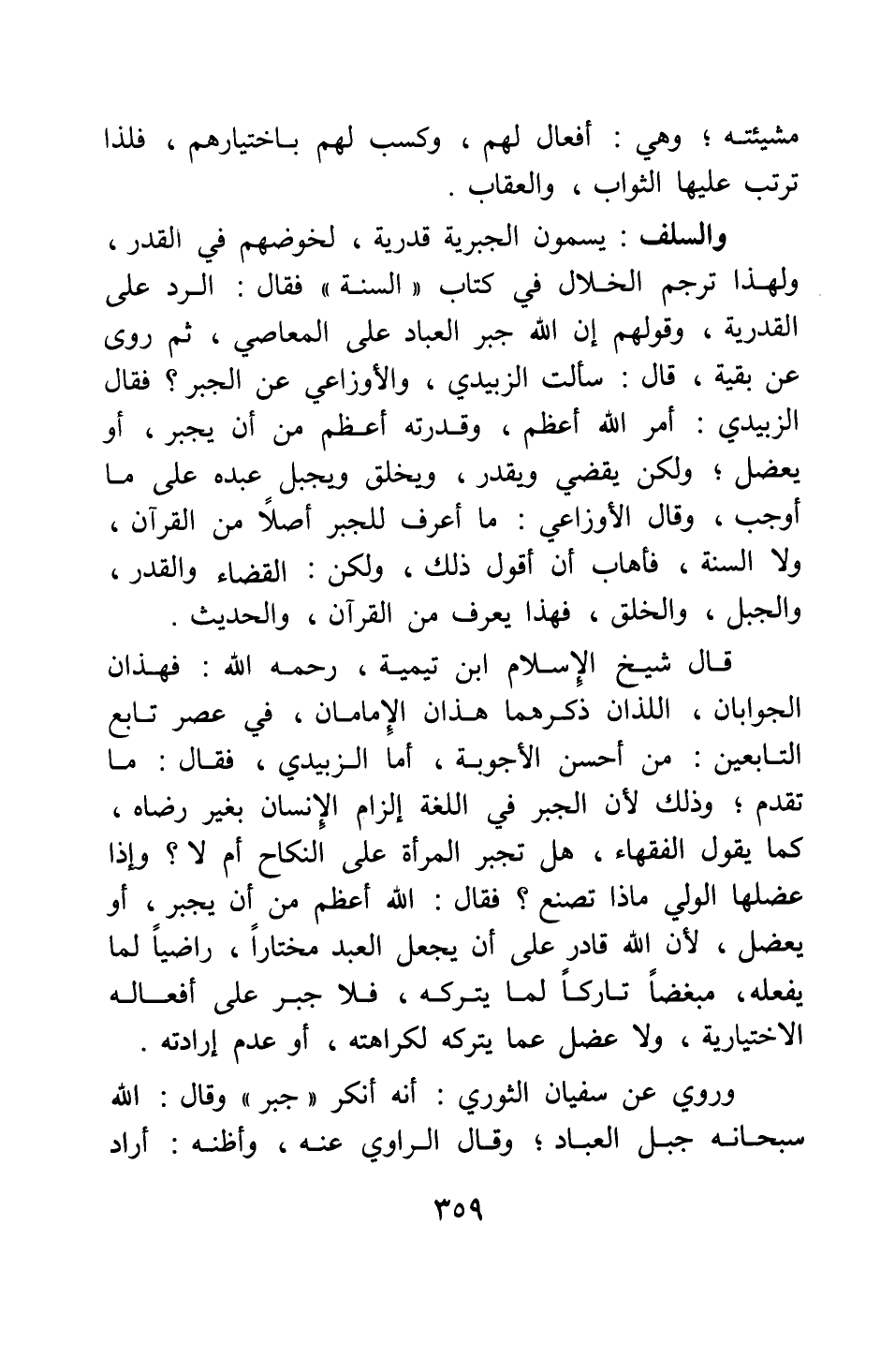 قال شيخ الإسلام ابن تيمية، رحمه الله: فهذان الجوابان اللذان ذكرهما هذان الإمامان في عصر تابع التابعين من أحسن الأجوبة. أما الزبيدي، فقال: ما تقدم، وذلك لأن الجبر في اللغة إلزام الإنسان بغير رضاه، كما يقول الفقهاء، هل تجبر المرأة على النكاح أم لا؟ وإذا عضلها الولي ماذا تصنع؟ فقال: الله أعظم من أن يجبر، أو يعضل، لأن الله قادر على أن يجعل العبد مختارا راضيا لما يفعله، مبغضا تاركا لما يتركه، فلا جبر على أفعاله الاختيارية، ولا عضل عما يتركه لكراهته، أو عدم إرادته.