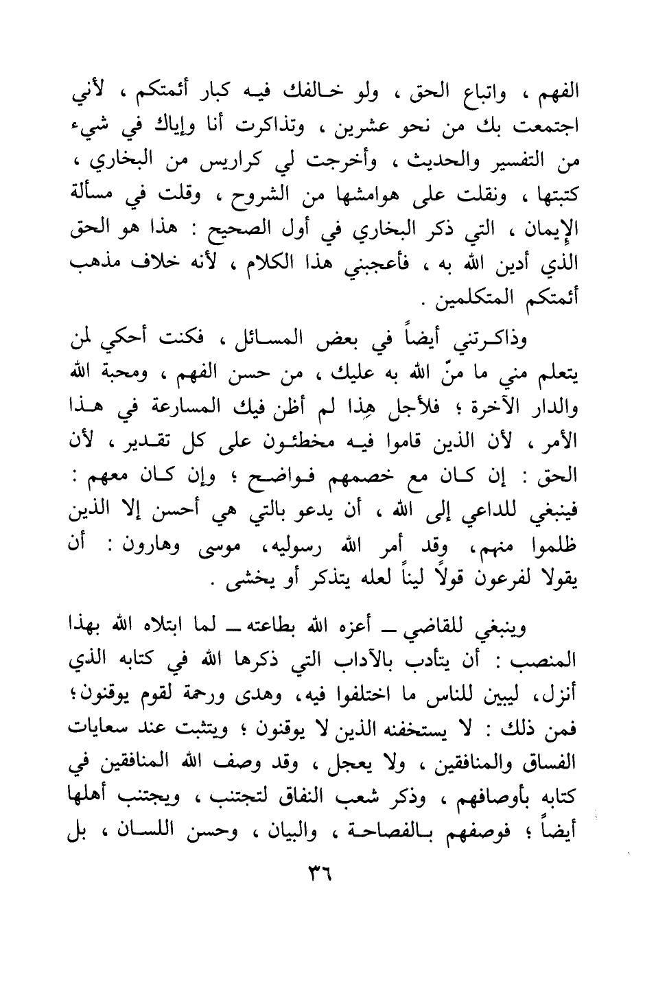 الفهم، واتباع الحق، ولو خالفك فيه كبار أئمتكم، لأني اجتمعت بك من نحو عشرين، وتذاكرت أنا وإياك في شيء من التفسير والحديث، وأخرجت لي كراريس من البخاري، كتبتها، ونقلت على هوامشها من الشروح، وقلت في مسألة الإيمان، التي ذكر البخاري في أول الصحيح: هذا هو الحق الذي أدين الله به، فأعجبني هذا الكلام، لأنه خلاف مذهب أئمتكم المتكلمين.
