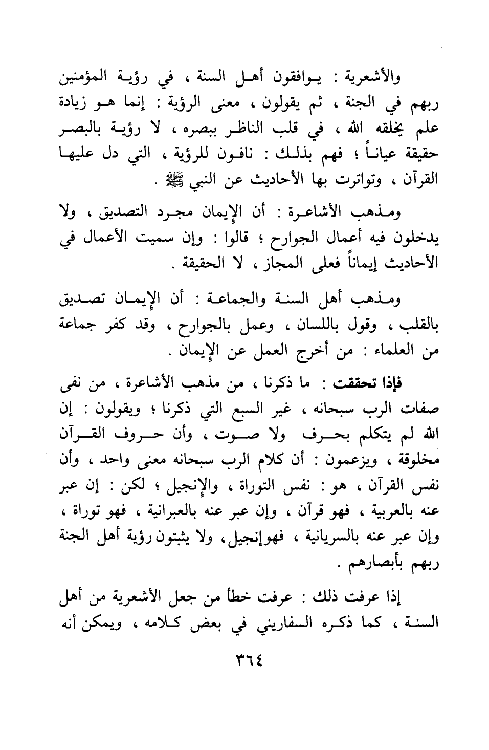 ومذهب أهل السنة والجماعة أن الإيمان تصديق بالقلب، وقول باللسان، وعمل بالجوارح. وقد كفر جماعة من العلماء من أخرج العمل عن الإيمان. فإذا تحققت ما ذكرنا من مذهب الأشاعرة، من نفي صفات الرب سبحانه غير السبع التي ذكرنا، ويقولون: إن الله لم يتكلم بحرف ولا صوت، وأن حروف القرآن مخلوقة، ويزعمون أن كلام الرب سبحانه معنى واحد، وأن نفس القرآن هو نفس التوراة والإنجيل، لكن إن عبر عنه بالعربية فهو قرآن، وإن عبر عنه بالعبرانية فهو توراة، وإن عبر عنه بالسريانية فهو إنجيل. ولا يثبتون رؤية أهل الجنة ربهم بأبصارهم. إذا عرفت ذلك، عرفت خطأ من جعل الأشعرية من أهل السنة، كما ذكره السفاريني في بعض كلامه، ويمكن أنه