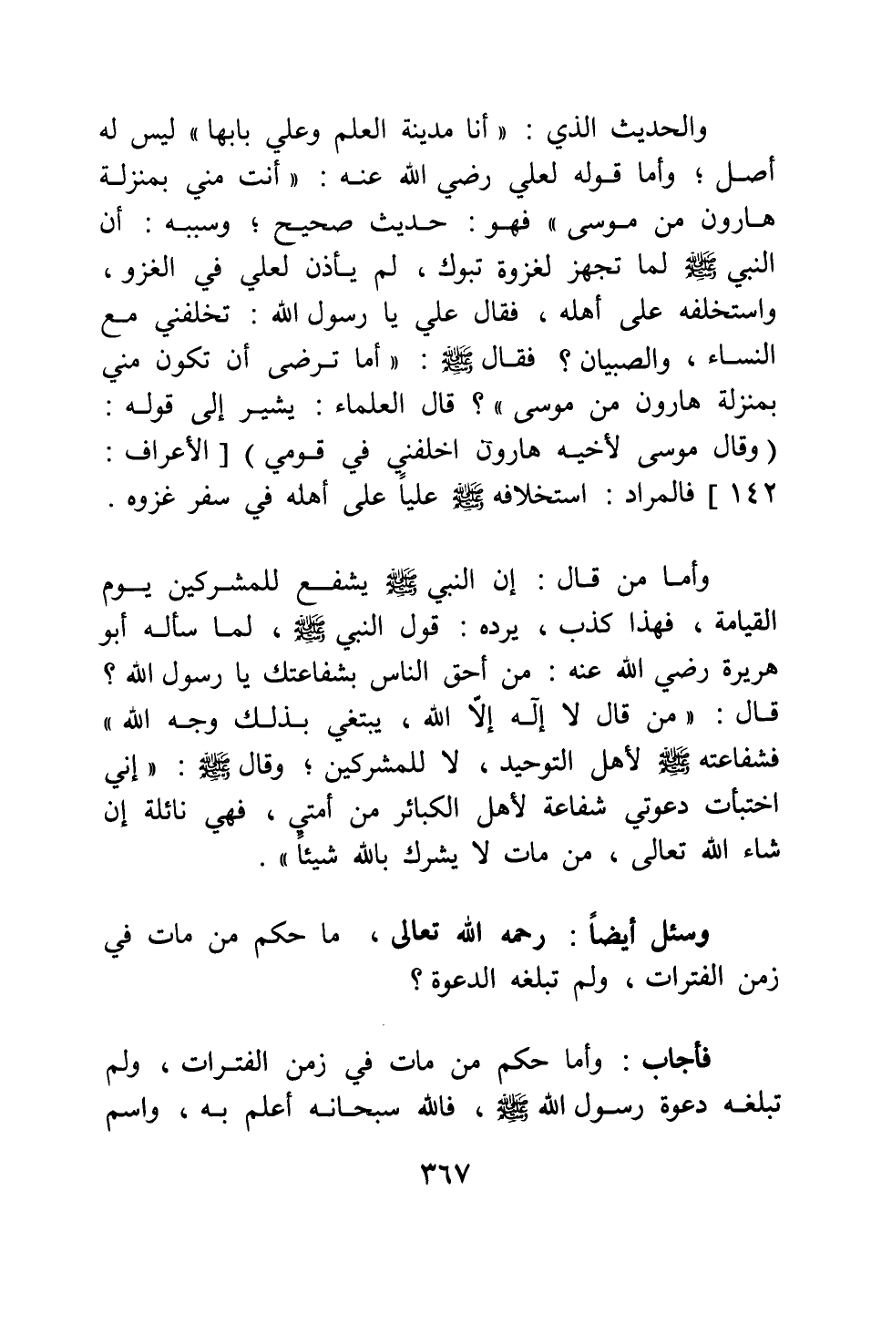 والحديث الذي: " أنا مدينة العلم وعلي بابها " 1 ليس له أصل. وأما قوله لعلي رضي الله عنه:" أنت مني بمنْزلة هارون من موسى " 2 فهو: حديث صحيح، وسببه: أن النبي صلى الله عليه وسلم لما تجهز لغزوة تبوك، لم يأذن لعلي في الغزو، واستخلفه على أهله، فقال علي: يا رسول الله، تخلفني مع النساء، والصبيان؟ فقال صلى الله عليه وسلم: " أما ترضى أن تكون مني بمنْزلة هارون من موسى " 3. قال العلماء: يشير إلى قوله: {وَقَالَ مُوسَى لأَخِيهِ هَارُونَ اخْلُفْنِي فِي قَوْمِي} [سورة الأعراف آية: 142] ، فالمراد: استخلافه صلى الله عليه وسلم عليا على أهله في سفر غزوه.